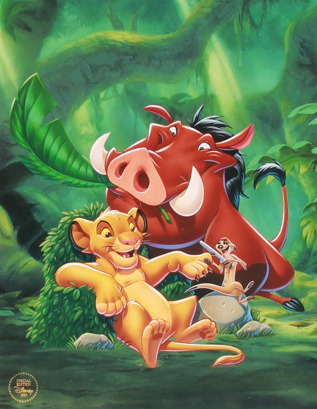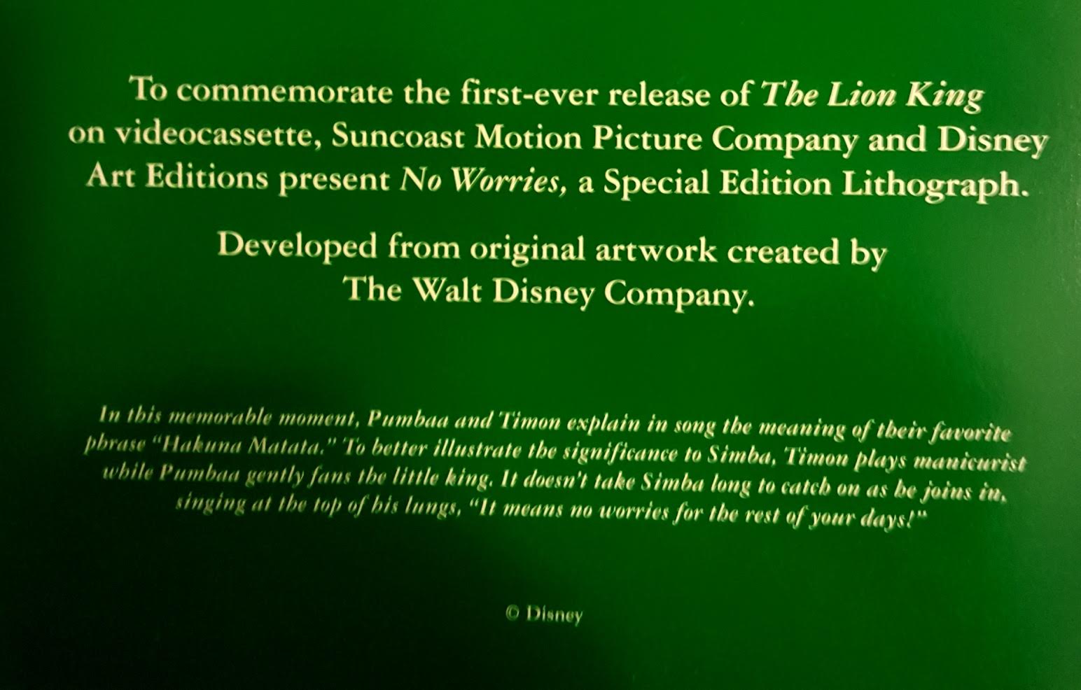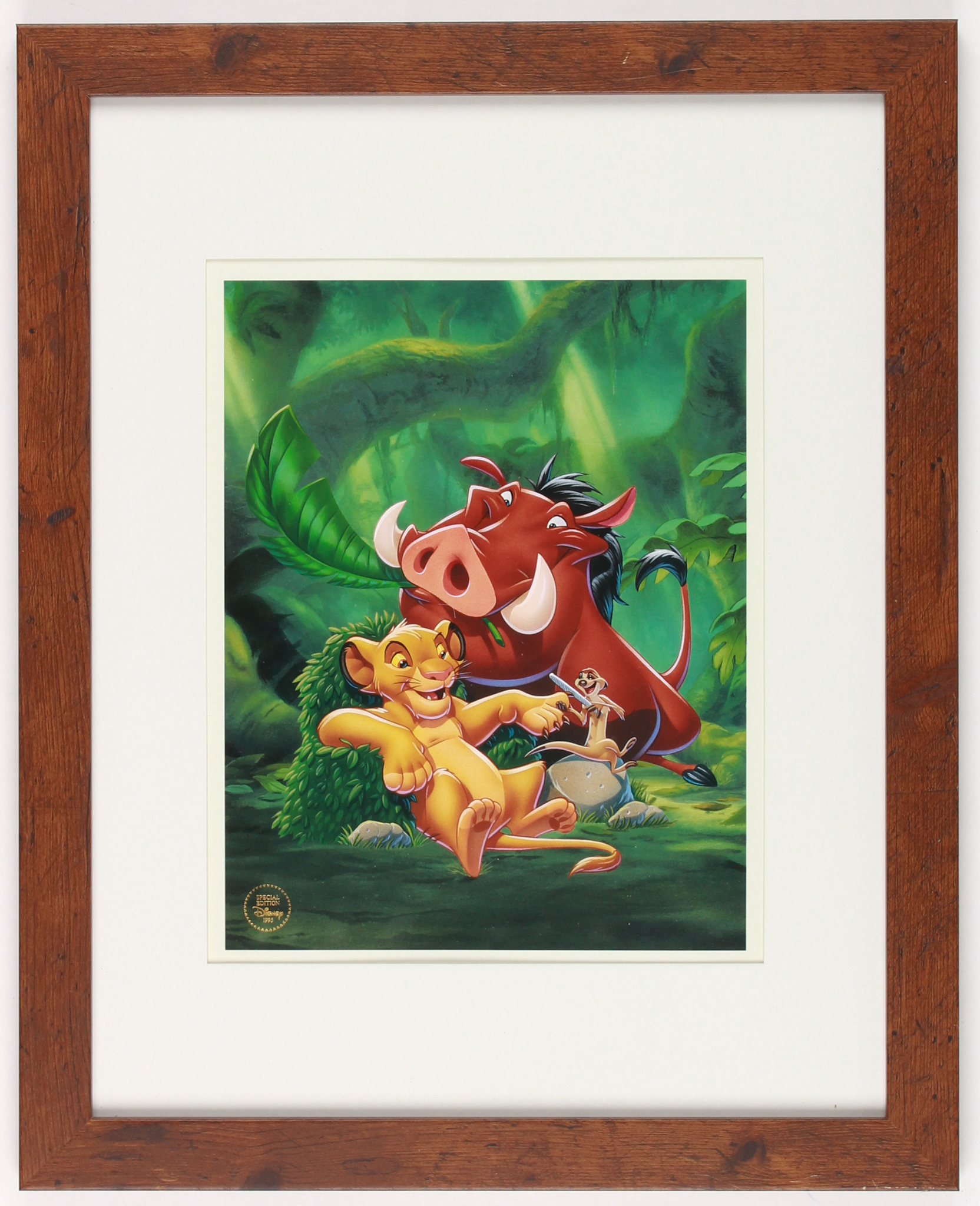 Custom frame measures 12.5" x 15.5" in size. Hakuna Matata Simba, Timon & Pumbaa "The Lion King: No Worries" 1995 Walt Disney Special Edition Lithograph.