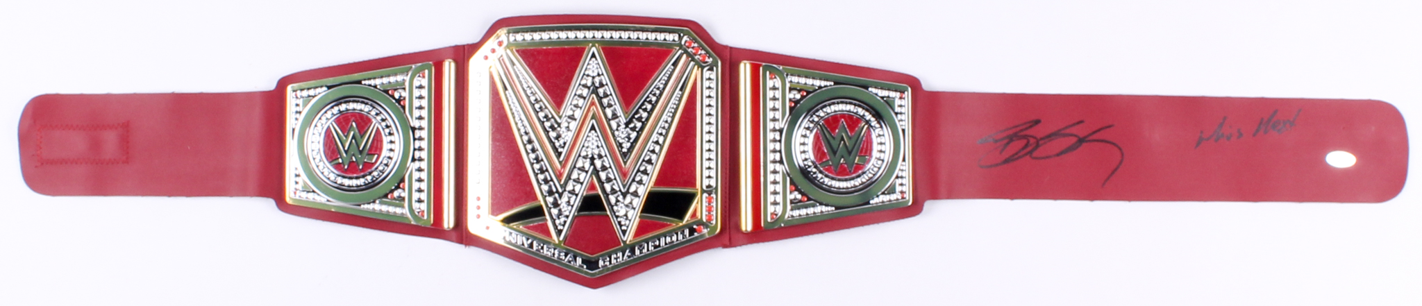Replica WWE Universal Championship Belt (plastic) hand-signed and inscribed in black felt-tip pen by Bill Goldberg. The belt is approximately 38" in length.