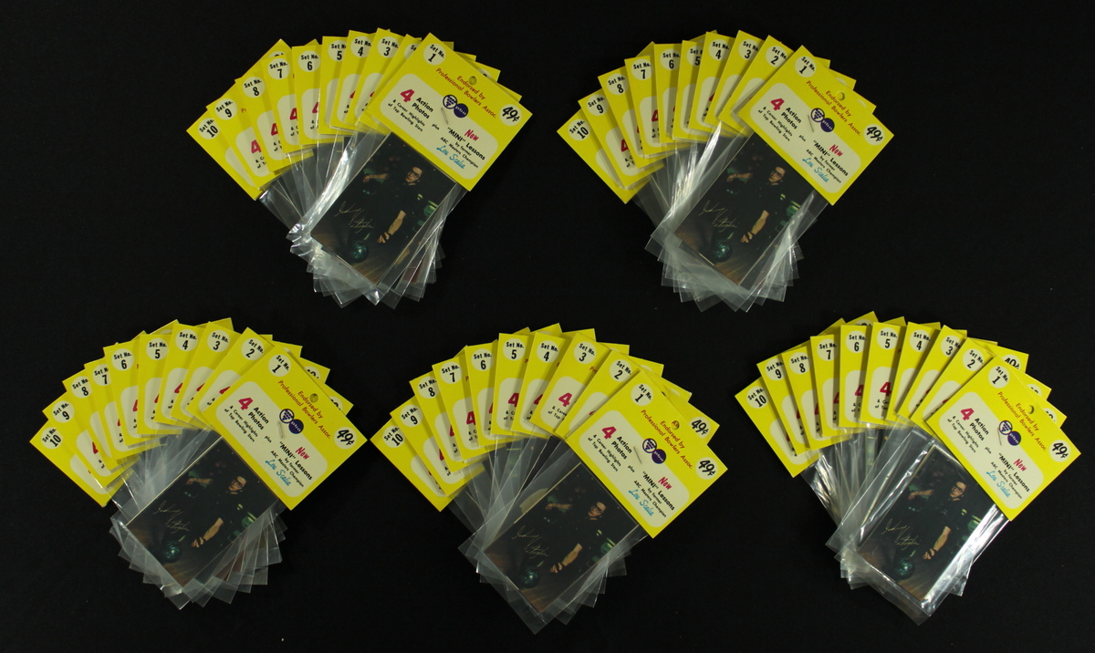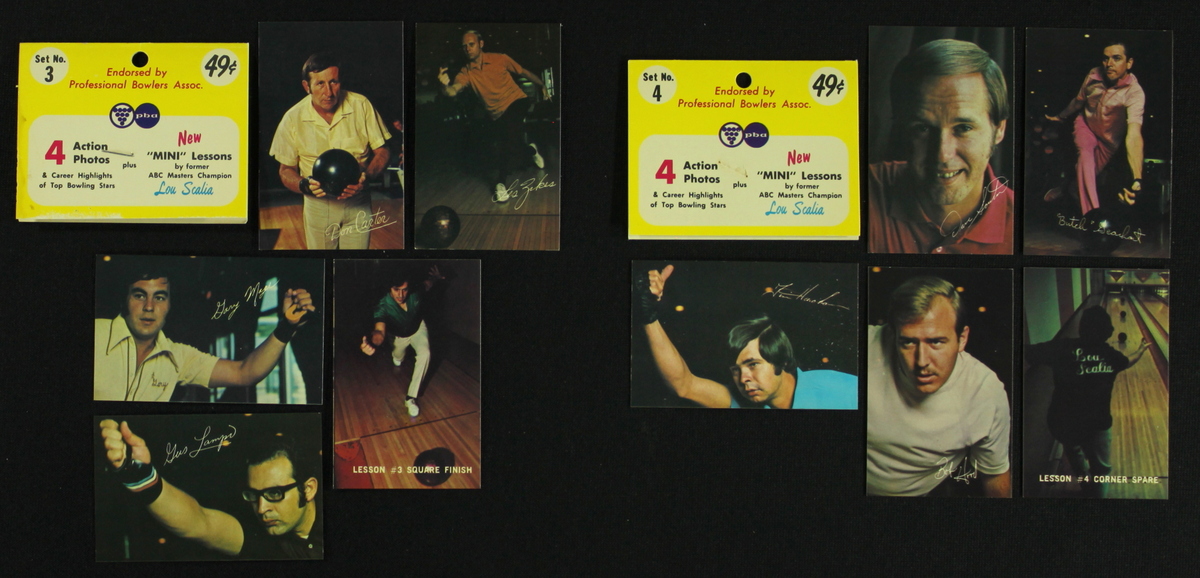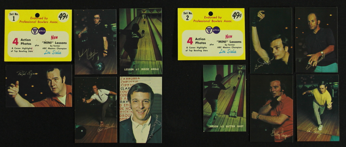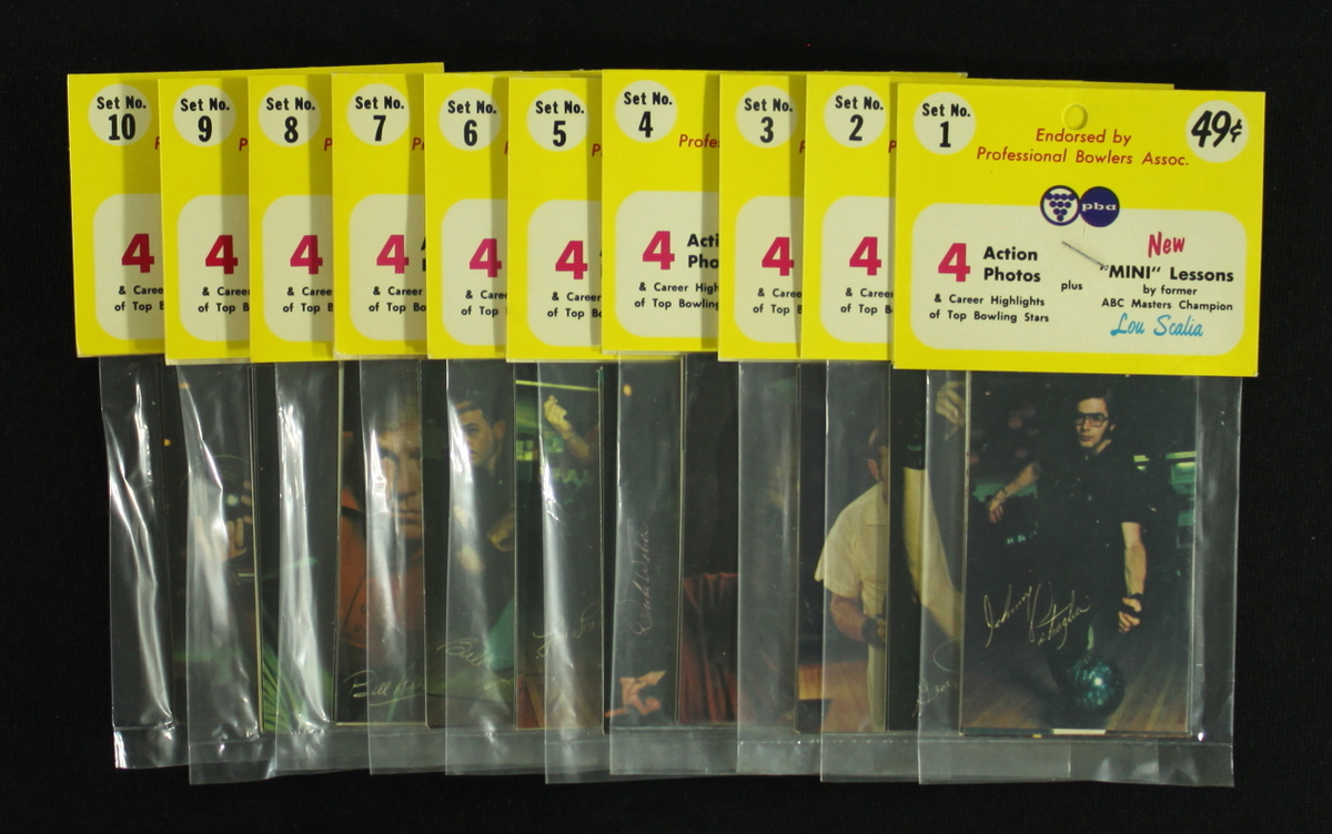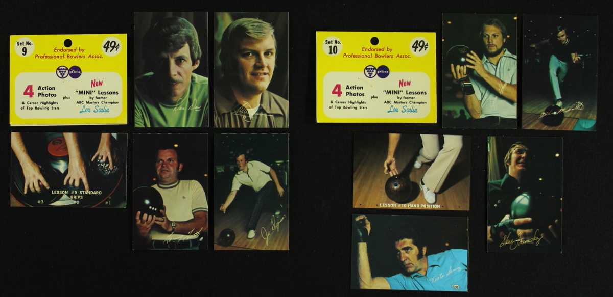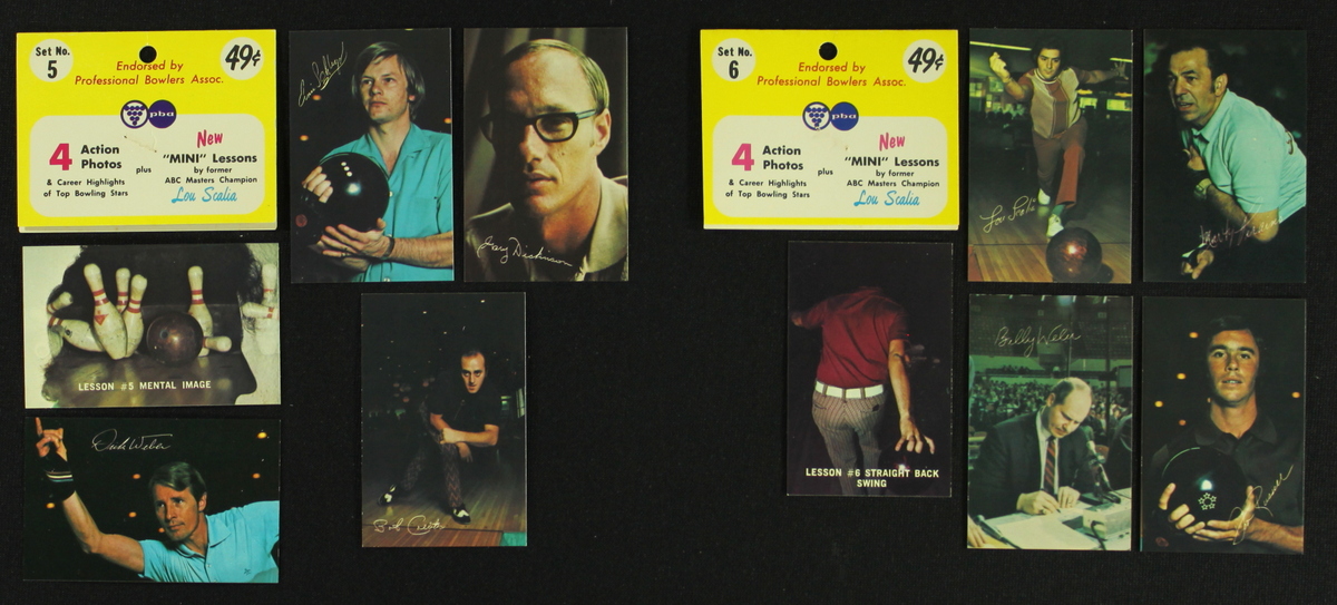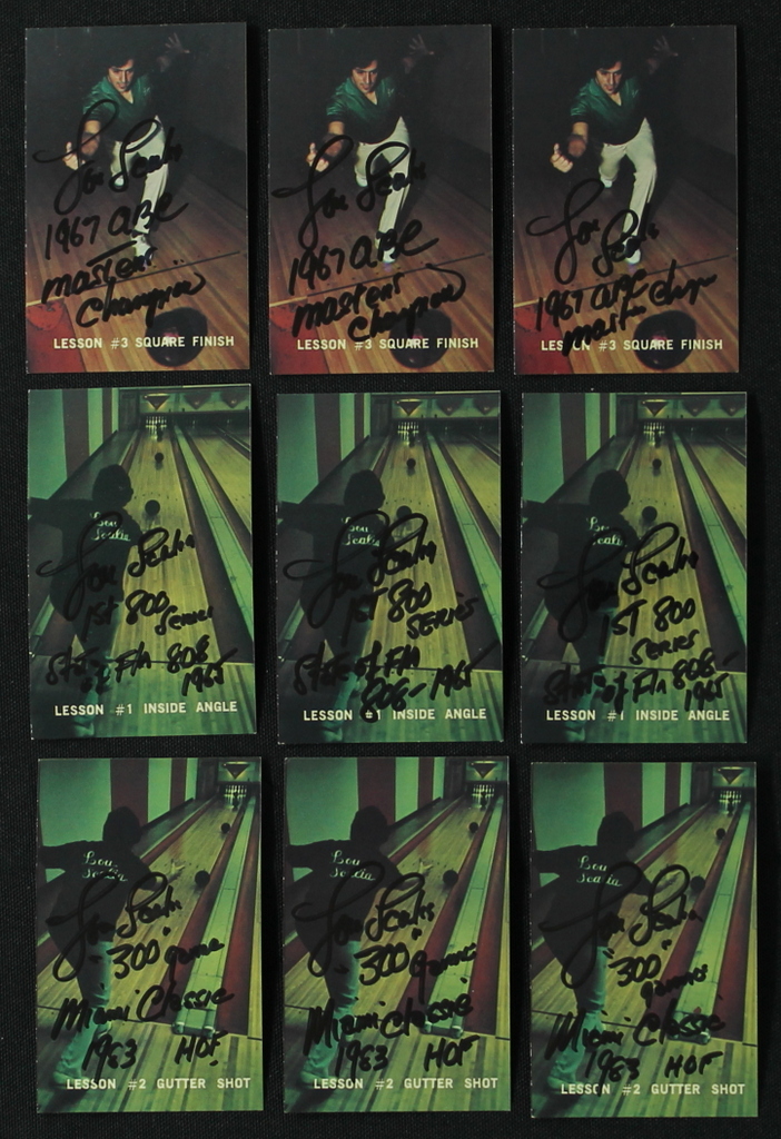 Lot includes (3) complete sets of bowling cards. Each set contains 10 subsets with 4 cards each. Lot includes Johnny Petraglia, Don Carter, Dick Weber, Dave Davis and others. The lot also includes (9) additional cards from the set each hand-signed and inscribed by Lou Scalia.