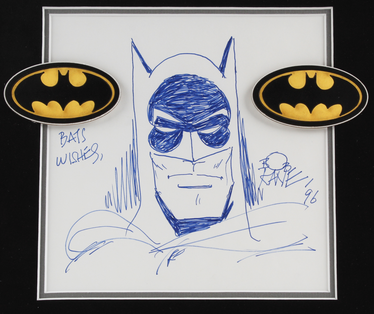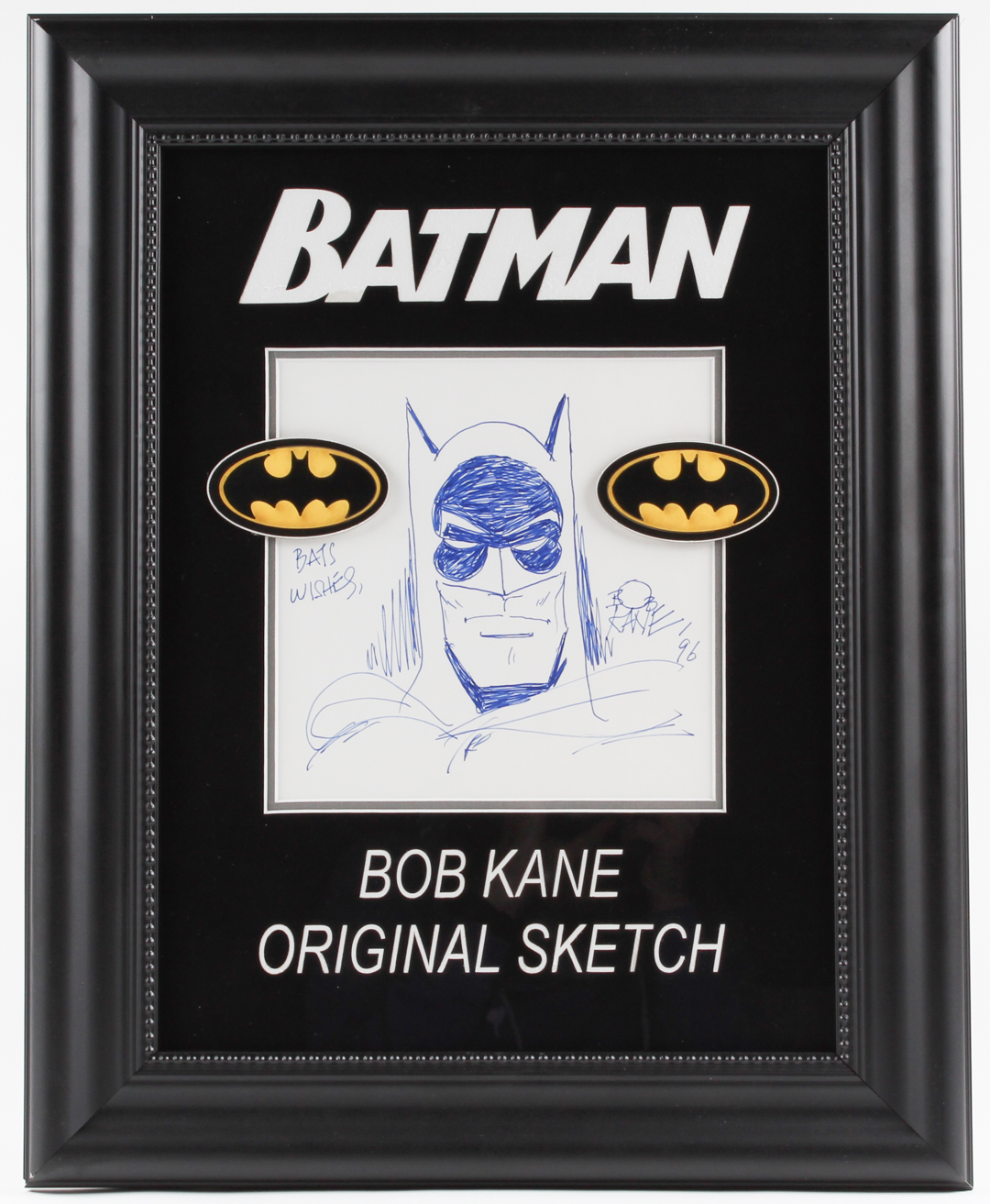 Custom framed "Batman" original sketch measures 16" x 20" in size and has been hand-signed and inscribed in blue ink pen by Bob Kane (D. 1998).