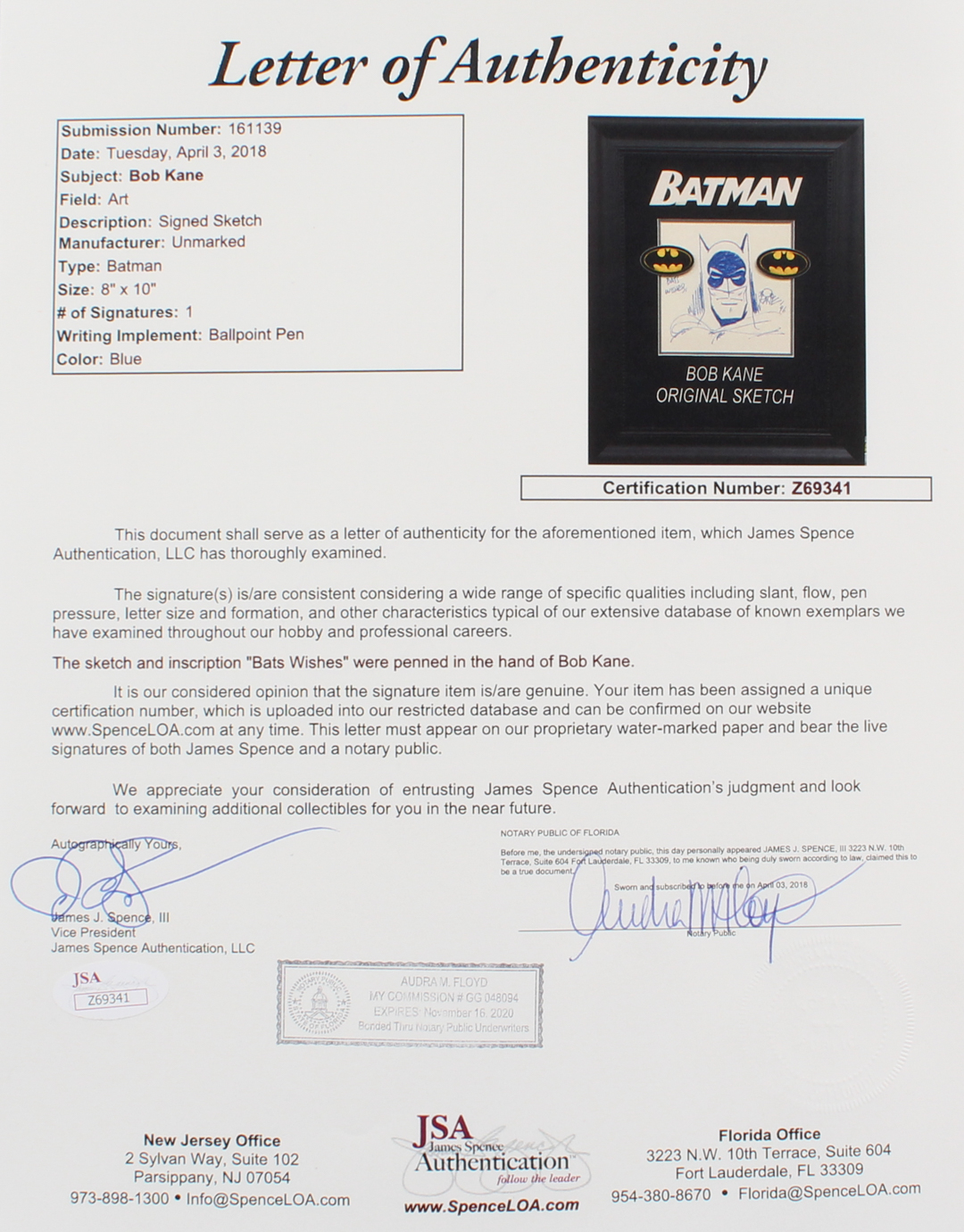 Bob Kane Signed "Batman" 16x20 Custom Framed Original Sketch Inscribed "Bats Wishes" (JSA LOA)