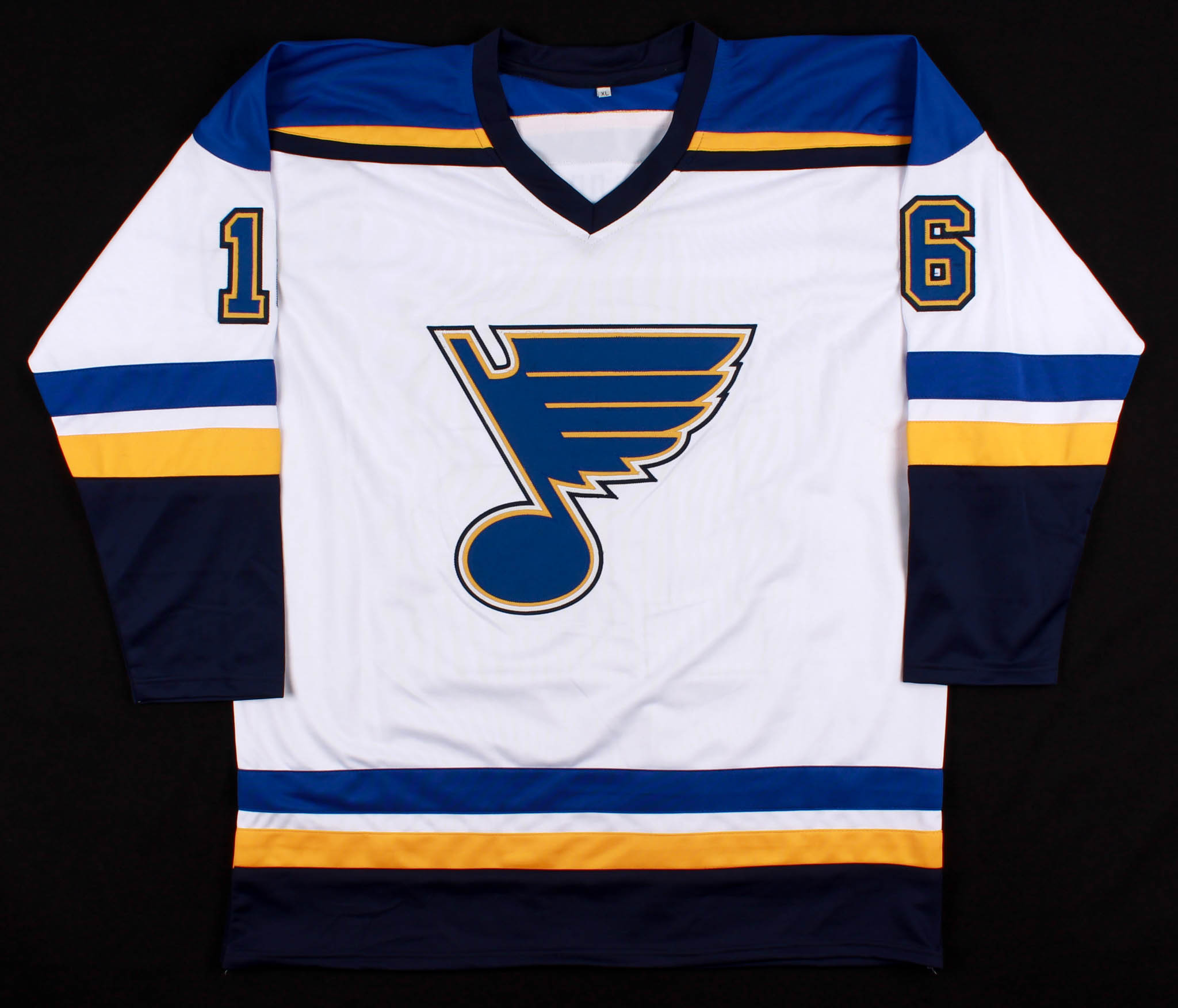 Custom on-ice style jersey. Everything is sewn on, size XL. Hand-signed and inscribed in silver paint pen by Brett Hull (HOF).