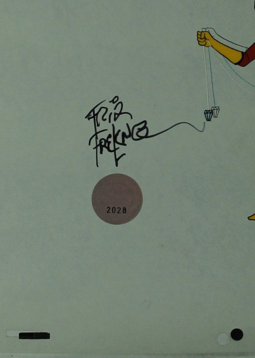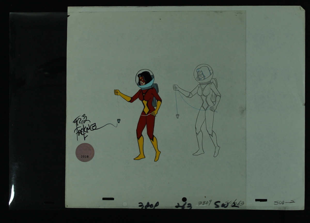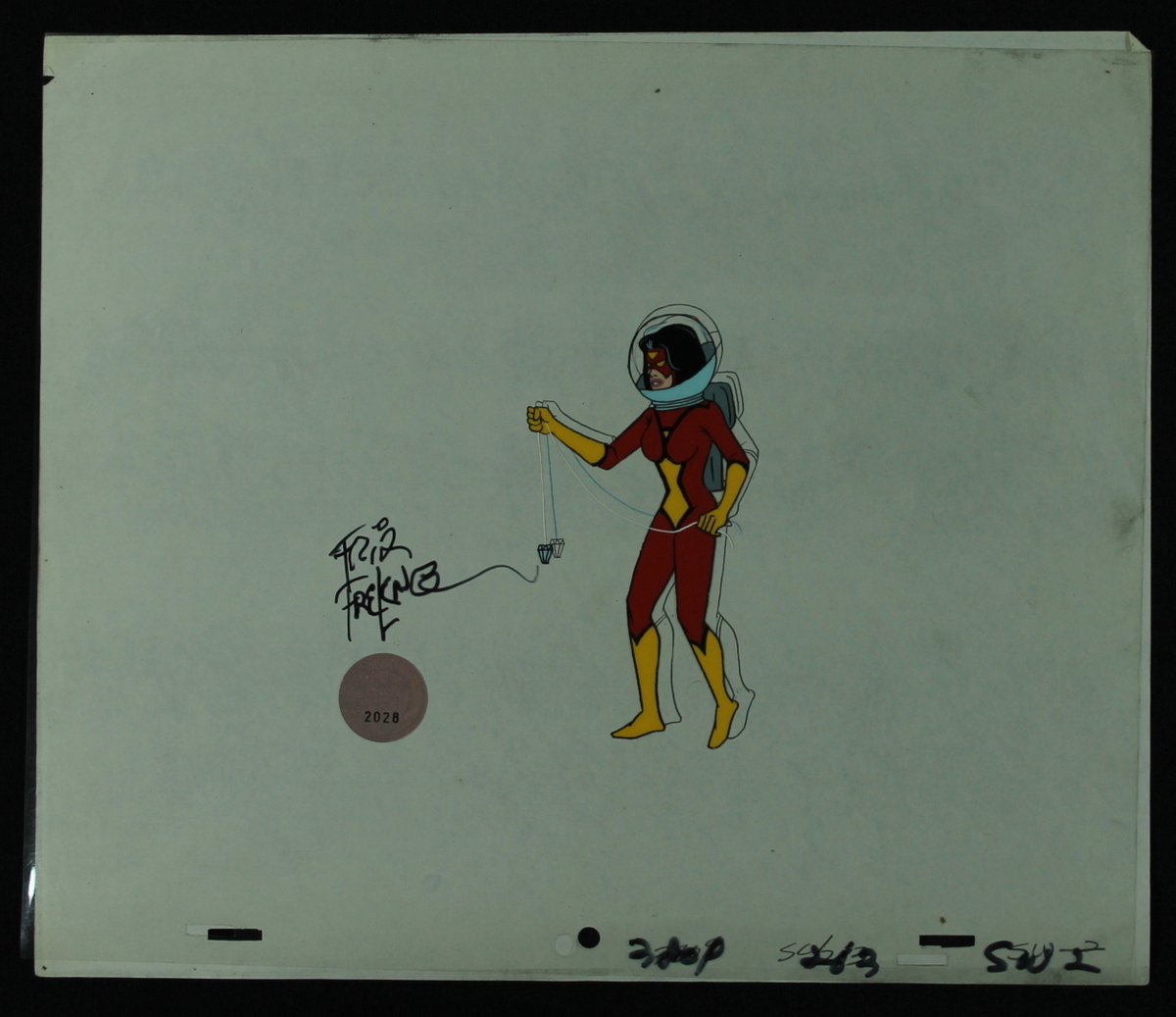 This lot include an original hand-painted and hand-inked Production Cel from Spider-Woman. The cel measures 10x12 in size. Spider-Woman was the first cartoon of Marvel Comics. Only 13 episodes of Spider-Woman exist. This is a rare opportunity to own a rare piece from this production (from the opening title sequence). The cel is hand-signed in black felt tip pen by animator Friz Freleng (D 1995).