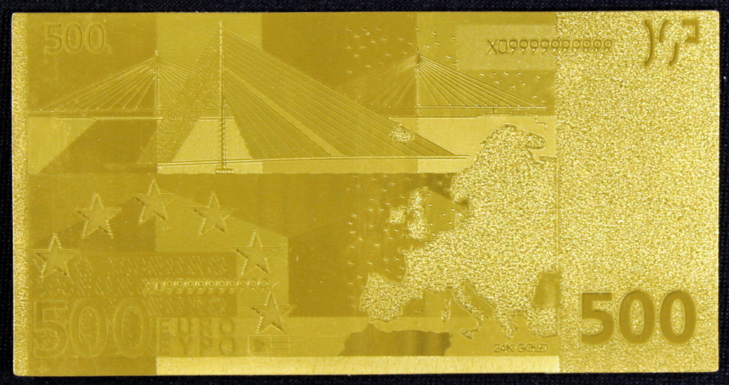 Created with 99.9% pure 24 carat gold. Banknote is actual size of a 500 Euro bill and individually die-struck & hot pressed on polycarbonate to give it durability and strength.