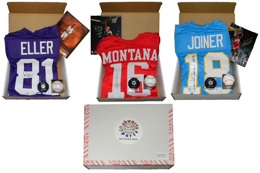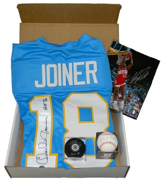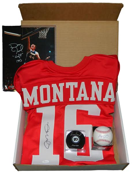 Limited to 75 Boxes. One Autographed Baseball, Puck, Football Jersey and Basketball 8x10 In Every Box (All Autographs are Hall of Famers)