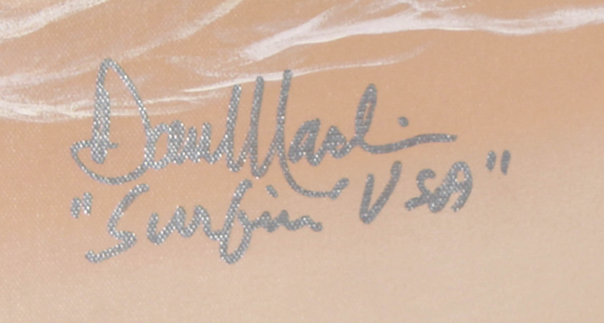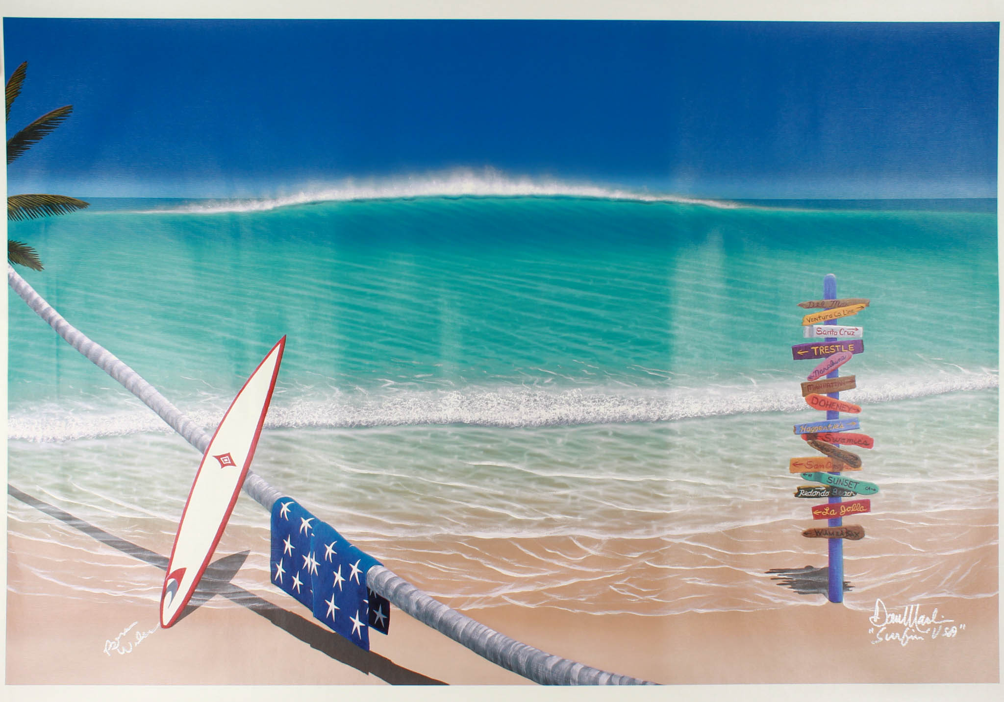 “Surfin' USA" is one of Brian Wilson’s earliest songs. This incredible artwork by Dan Mackin brings in the actual beach locations Brian wrote down for the songs. Mackin says if you look at the sign on the beach, you would be standing in San Clemente, California - the birthplace of Surfer Magazine. The red, white and blue of the surfboard and towel represent the USA. Signed by Brian Wilson and Dan Mackin. Limited Edition Fine Art Giclee on Canvas.