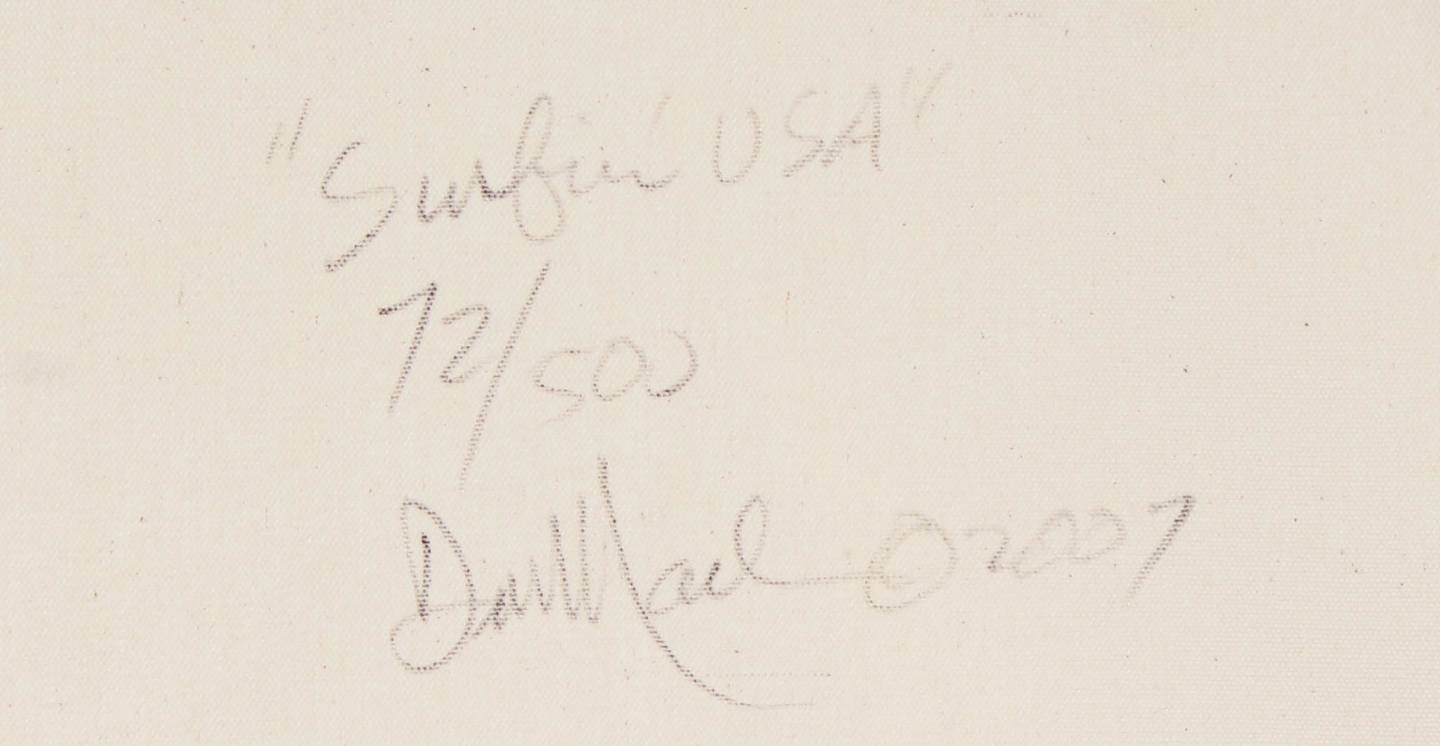 Hand signed in black felt-tip pen by Brian Wilson (The Beach Boys). Hand-embellished, hand-numbered and hand-signed by the original artist, Dan Mackin. Limited edition # 72/500. The piece measures approximately 34" x 48" in size (with border).