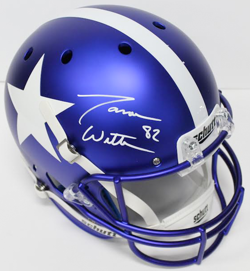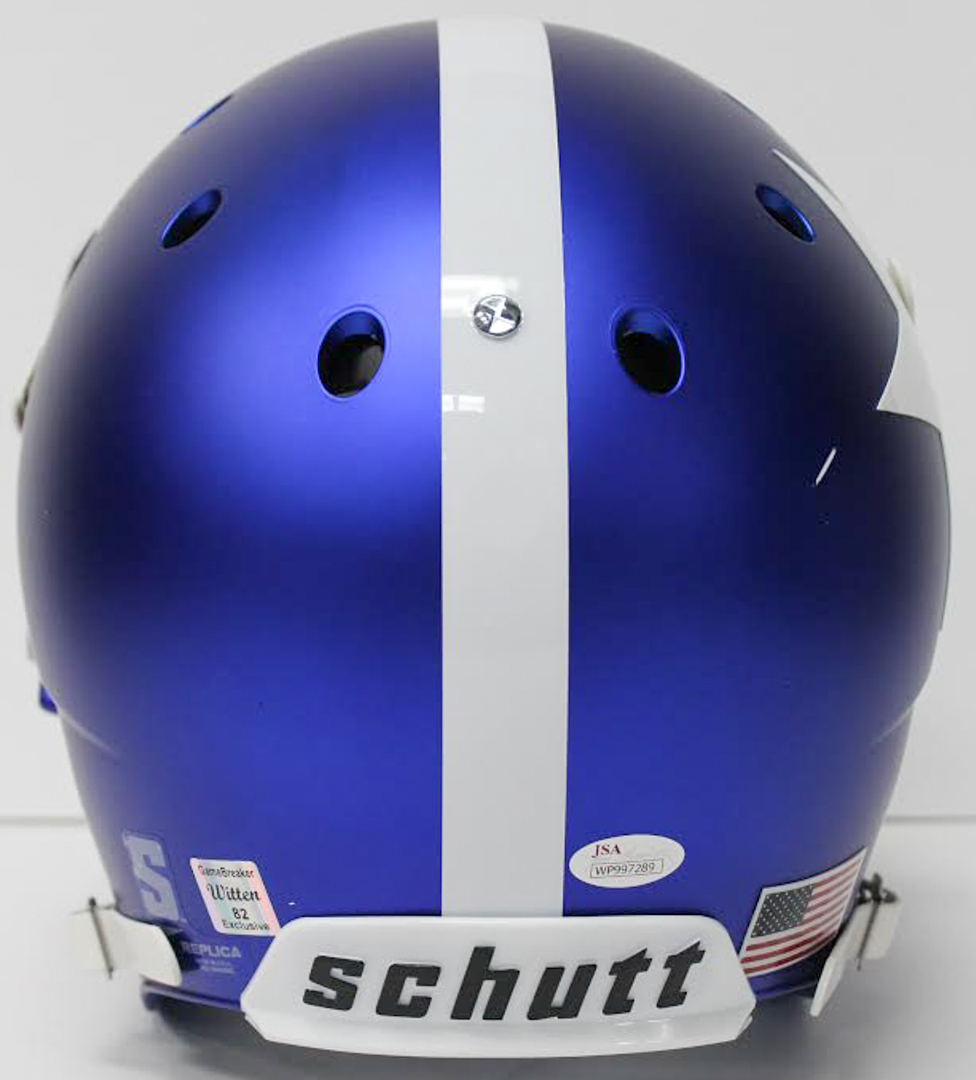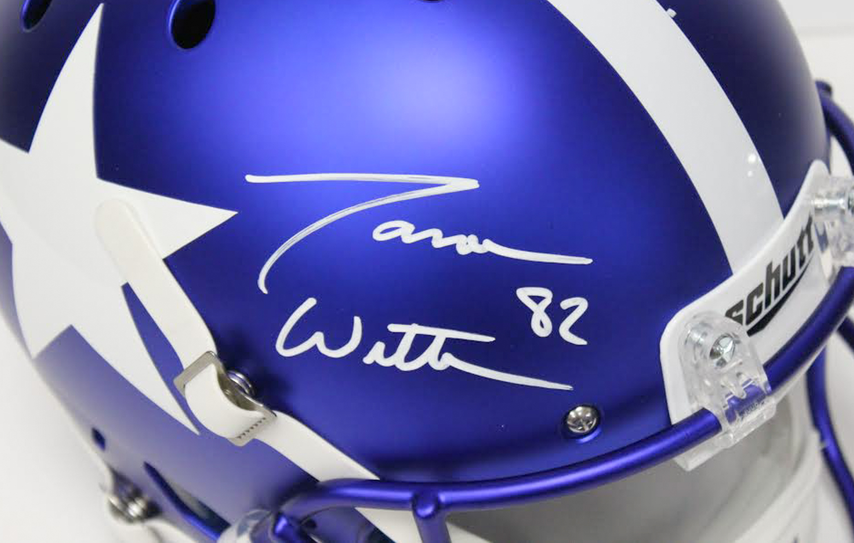 Schutt Dallas Cowboys Custom Satin Blue full-size replica helmet. Hand-signed in white paint pen by Jason Witten. Please note, the helmet does not have a logo on the side opposite the autograph.
