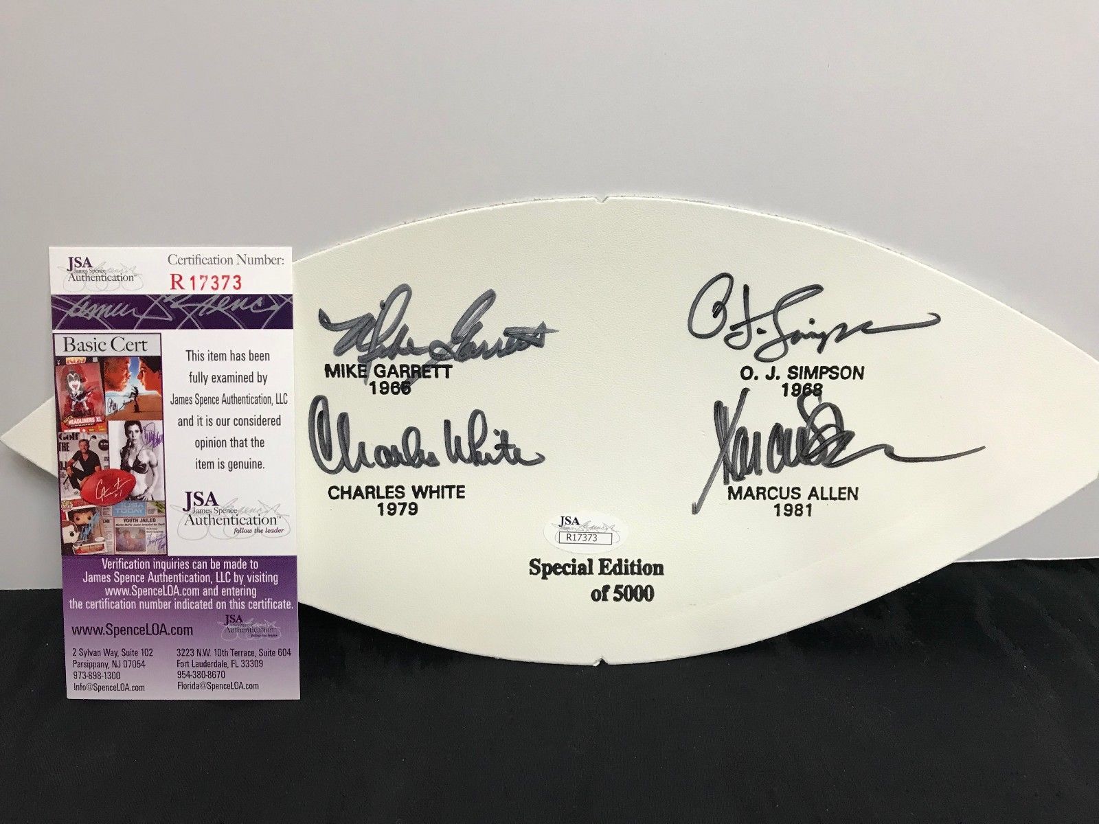 White football panel has been hand-signed in black felt-tip pen by (4) USC Heisman trophy receivers including O.J. Simpson (Bills, HOF), Charles White (Rams), Mike Garrett (Chiefs) and Marcus Allen (Raiders, HOF). Item is limited edition and has been numbered #/5,000.