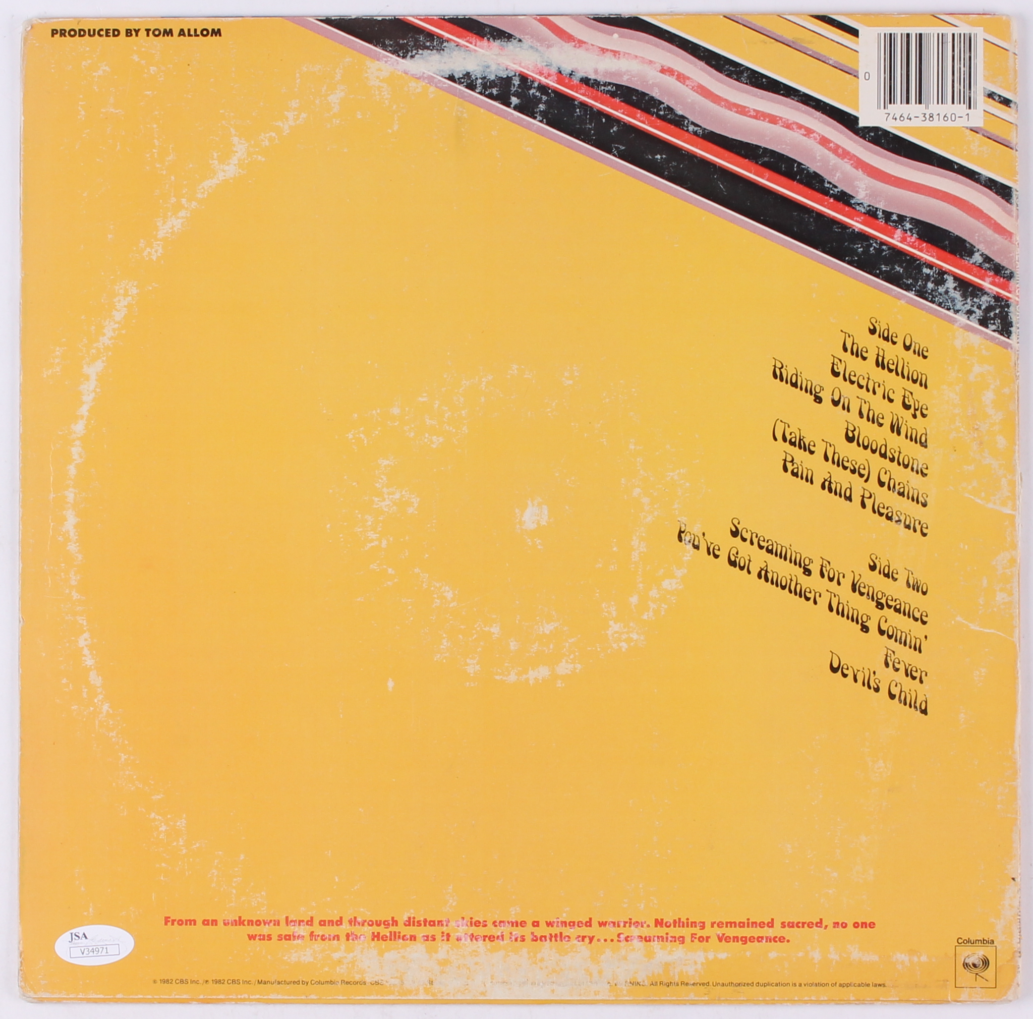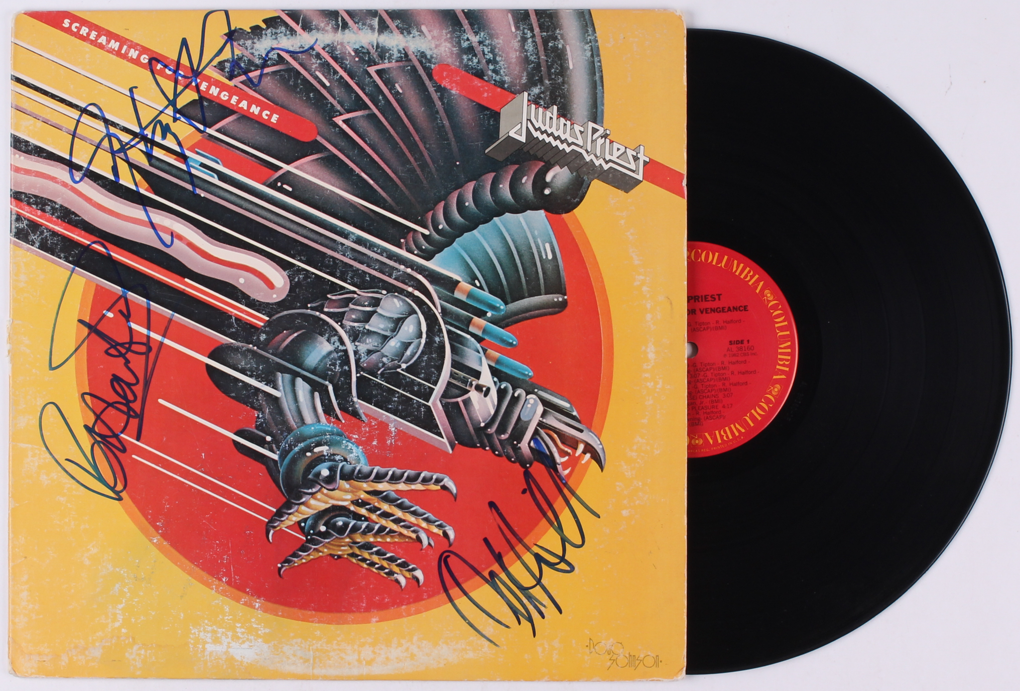 Judas Priest "Screaming for Vengeance" vinyl record album has been hand-signed in blue felt-tip pen by Rob Halford, Ian Hill, and Glenn Tipton. Please note, the vinyl record is included.