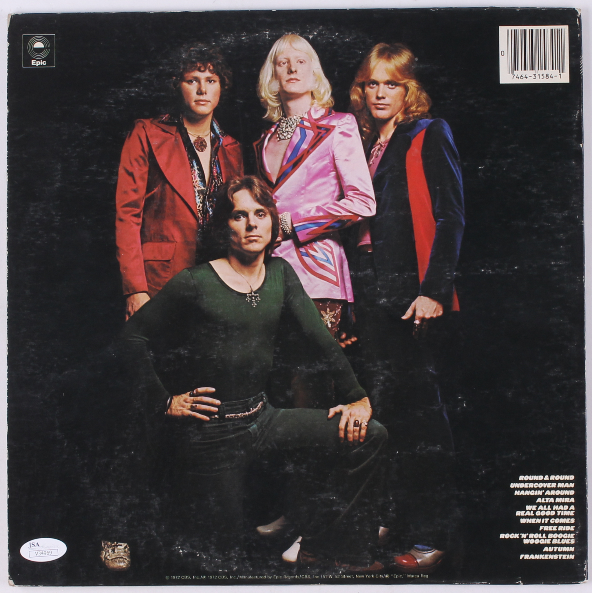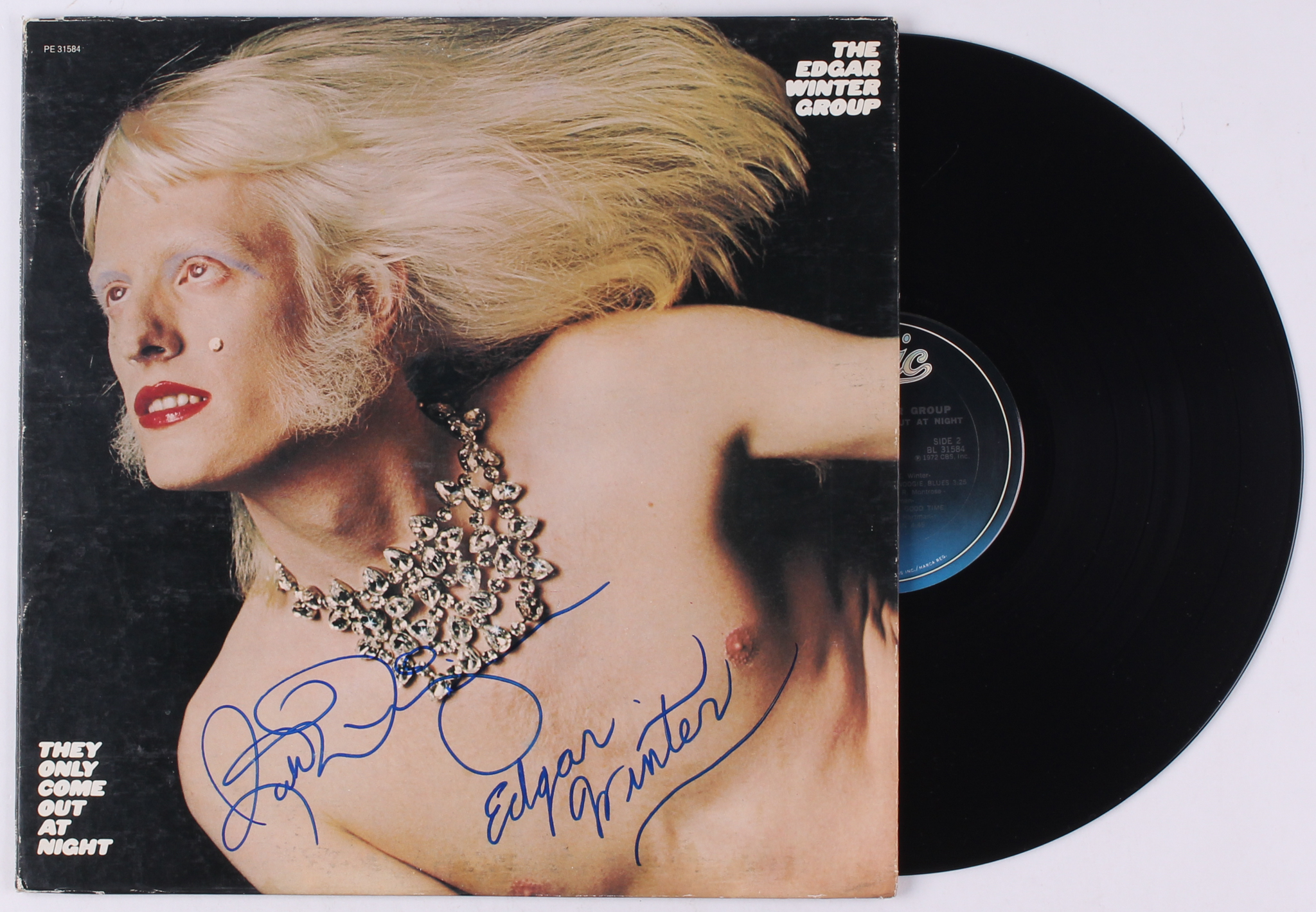 The Edgar Winter Group "They Only Come Out At Night" vinyl record album has been hand-signed in blue felt-tip pen by Edgar Winter and Rick Derringer. Please note, the vinyl record is included.