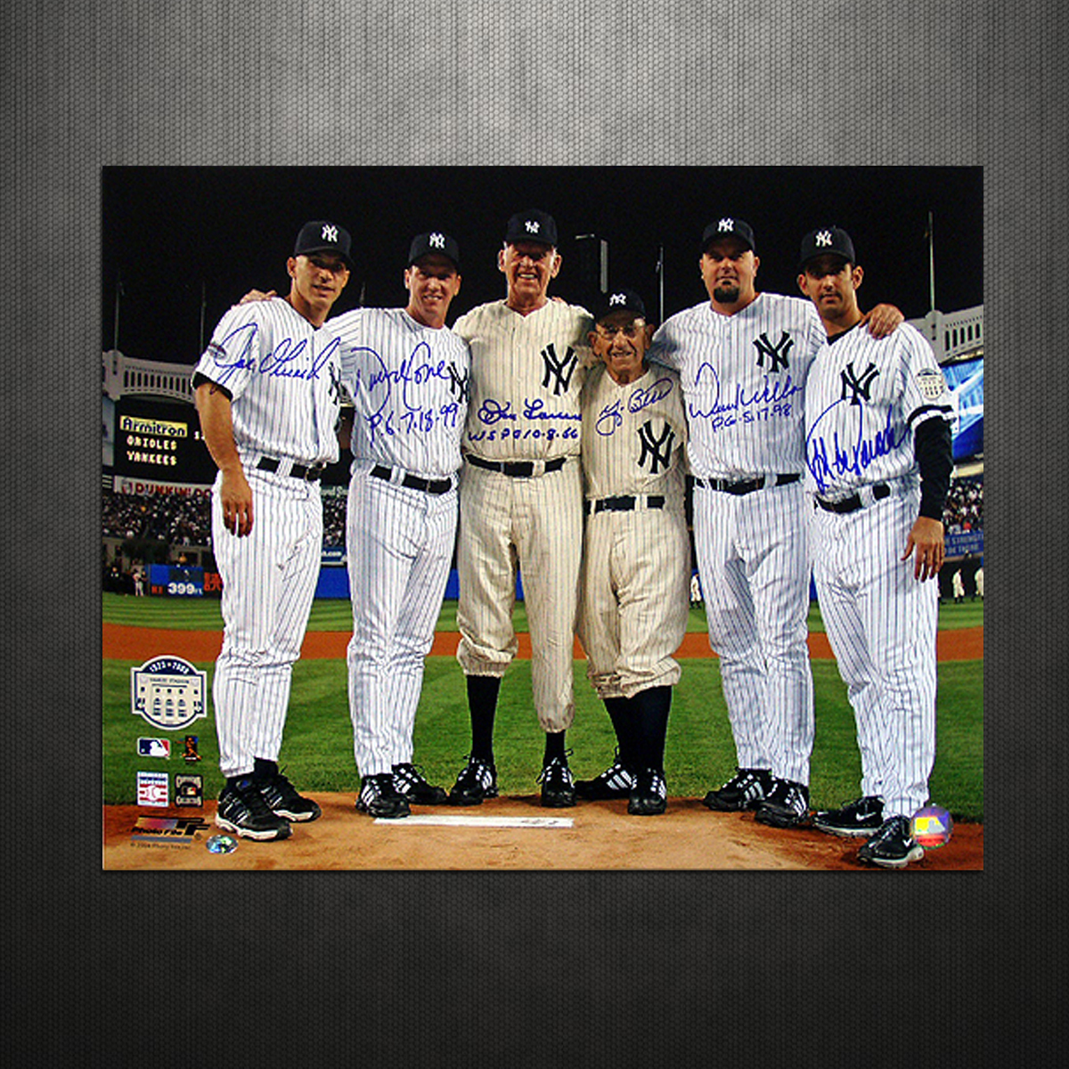 In 1956 NY Yankee Don Larsen became the first major league pitcher to throw a perfect game in the World Series. In Game Five versus the Brooklyn Dodgers, it took Larsen only 97 pitches to complete the game. Often overlooked Yogi Berra had a very important role in the perfect game, because he called the pitches that where thrown. Yogi Berra was so overcome with excitement that he jumped into Don Larsen's arms after the final out. David Wells had two tenures as a pitcher with the New York Yankees, spanning 1997-1998 and 2002-2003. Wells won the World Series with the Bombers in 1998 and earlier that same year, on May 17 in a game against the Minnesota Twins, he threw the first perfect game by a Yankees pitcher since Don Larsen in the 1956 World Series. David Cone joined the elite club of Major League pitchers to throw a perfect game. On July 18, 1999 against the Montreal Expos, with Don Larsen and Yogi Berra in attendance, David Cone becomes only the 17th pitcher to throw a perfect game. He struck out 10 and it took him only 88 pitches to complete the game. The pitchers and catchers of the only 3 perfect games in Yankees history are all together on this one piece: Joe Girardi, David Cone "PG 7-18-99.", Jorge Posada, David Wells "PG 5-17-98", Yogi Berra and Don Larsen "PG 10-8-56" have each hand signed this 16x20 photograph of them all at the mound during the pre-game ceremonies before the Final Game at Yankee Stadium on September 21st, 2008. This item comes complete with a Steiner Sports certificate of authenticity.