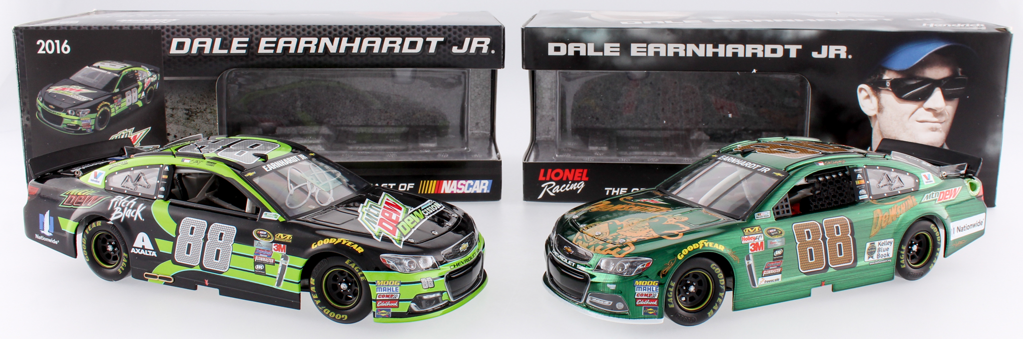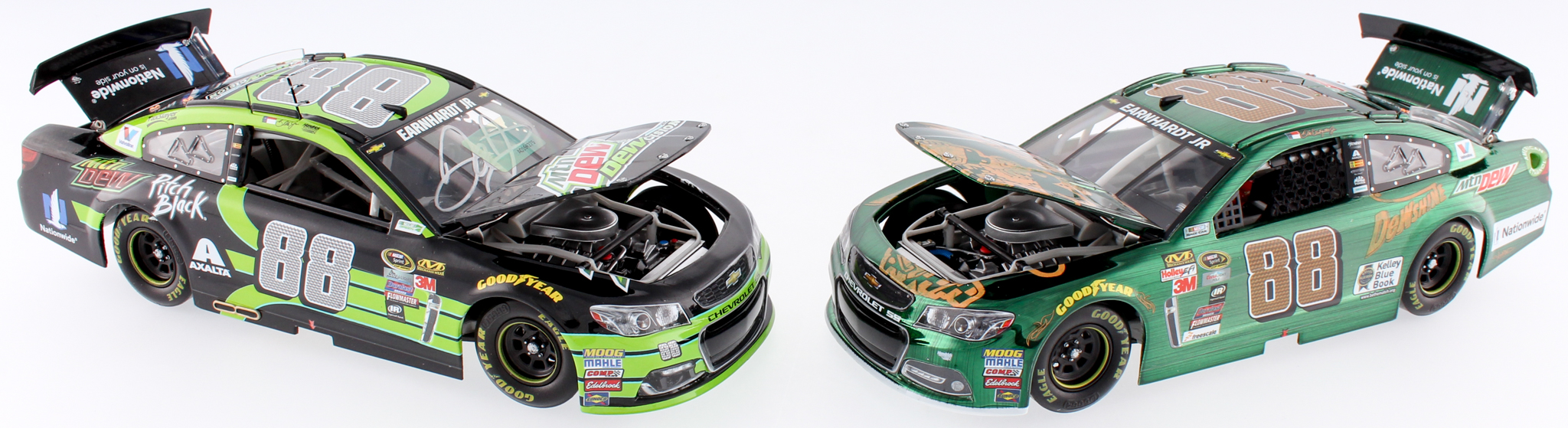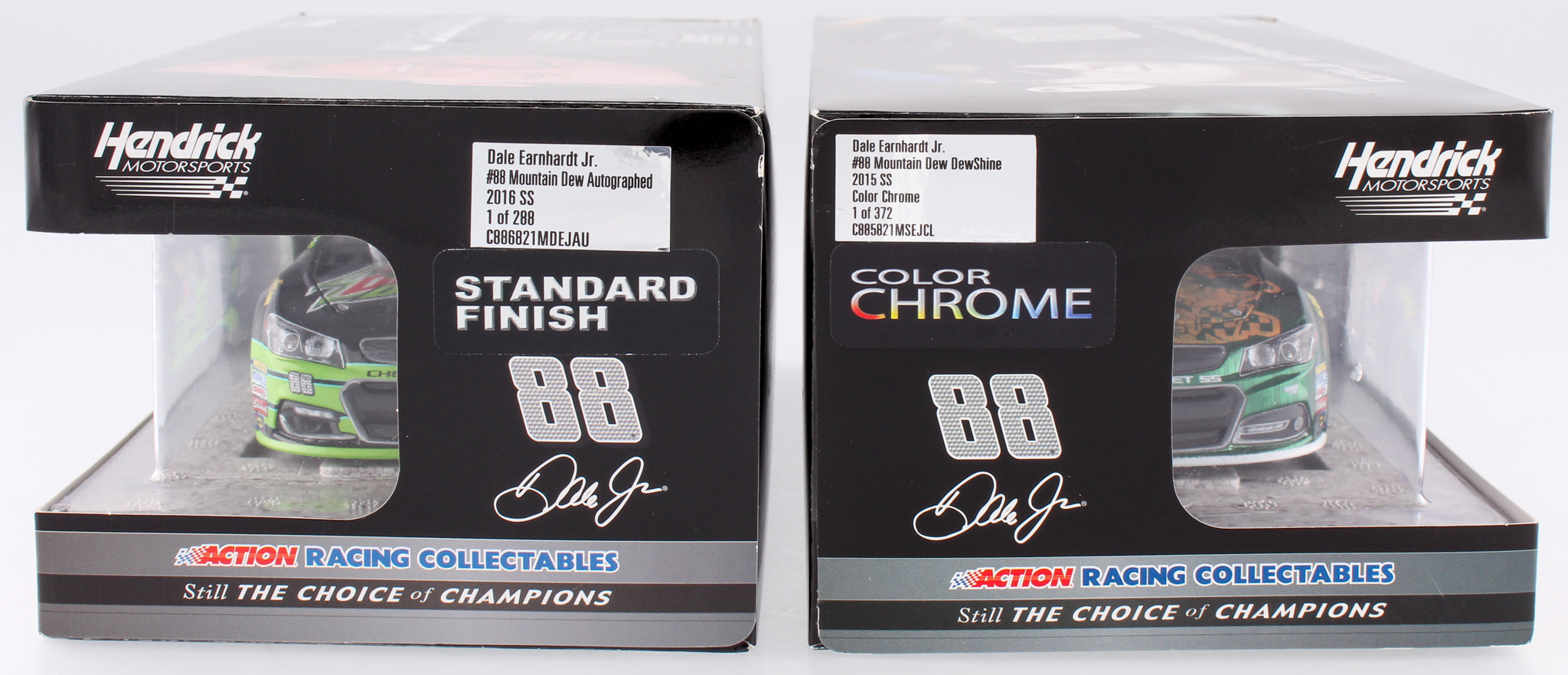 Lot of (2) Dale Earnhardt Jr. 1:24 Die Cast Cars with (1) Signed #88 Mountain Dew 2016 SS & (1) #88 Color Chrome Mountain Dew DewShine 2015 SS (Eanhardt Jr. Hologram)