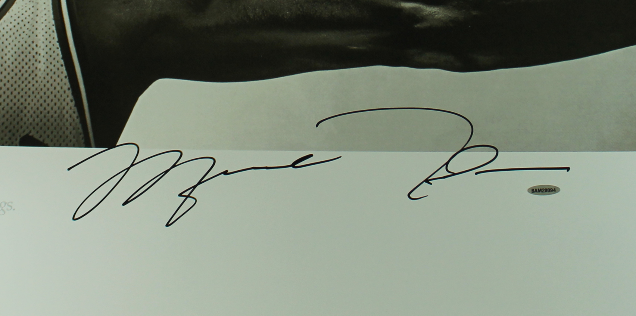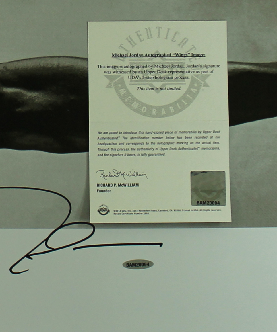 This iconic poster measures 72" x 23" in size and is hand-signed in black felt tip pen by Michael Jordan (Bulls HOF). The autograph includes an Upper Deck Authenticated hologram and matching COA for authenticity purposes.