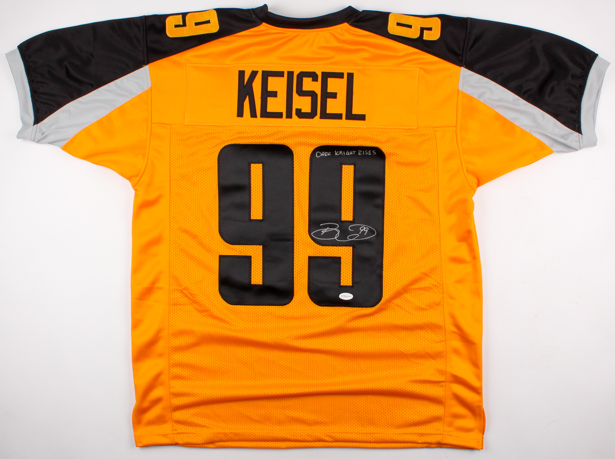 Custom on-field style jersey. Everything is sewn on, size XL. Hand-signed and inscribed in silver paint pen by Brett Keisel (Steelers)