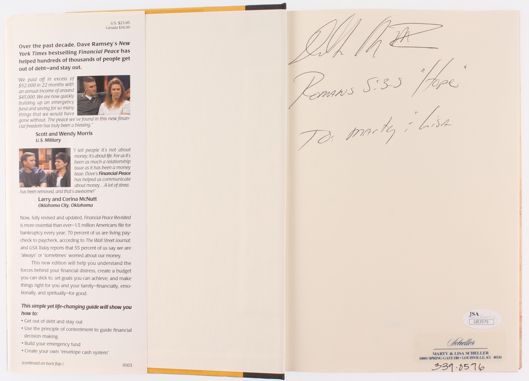 "Financial Peace Revisited" hardcover book has been hand-signed on the cover page in black ink pen by Dave Ramsey. Please note, the autograph has been personalized to Marty and Lisa.