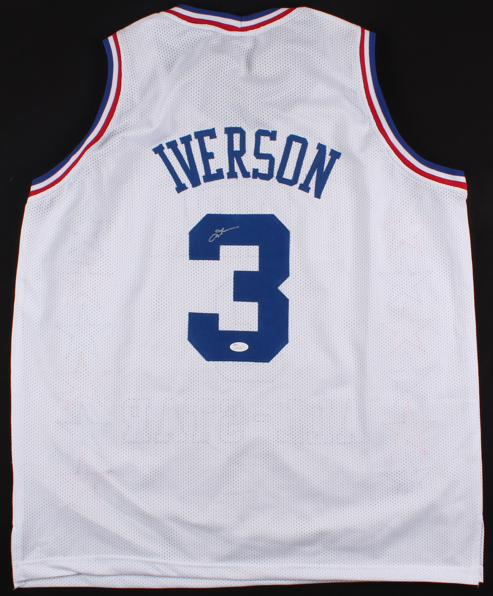Custom on-court style jersey. Everything sewn on, size XL. Hand-signed in silver paint pen by Allen Iverson (HOF).