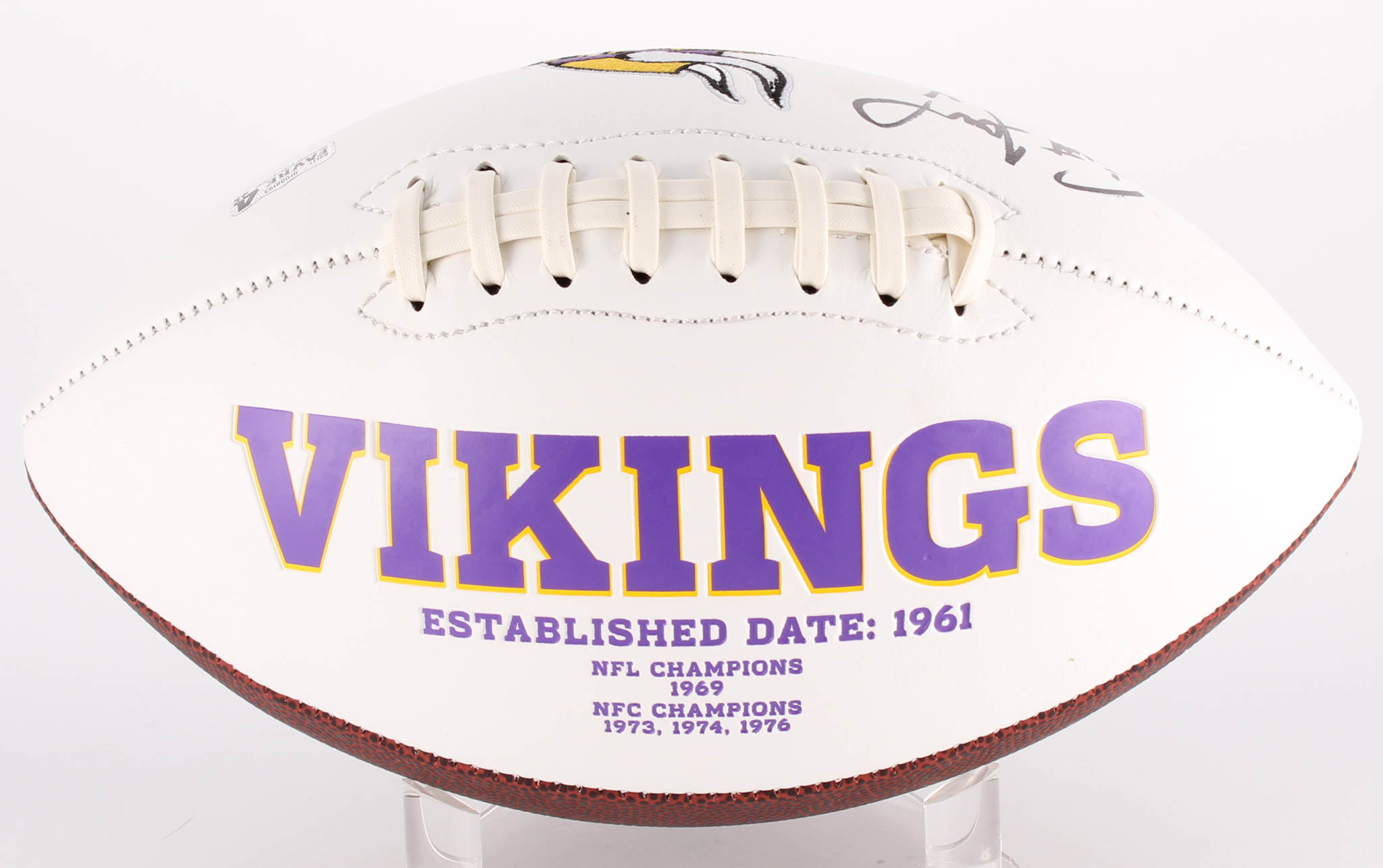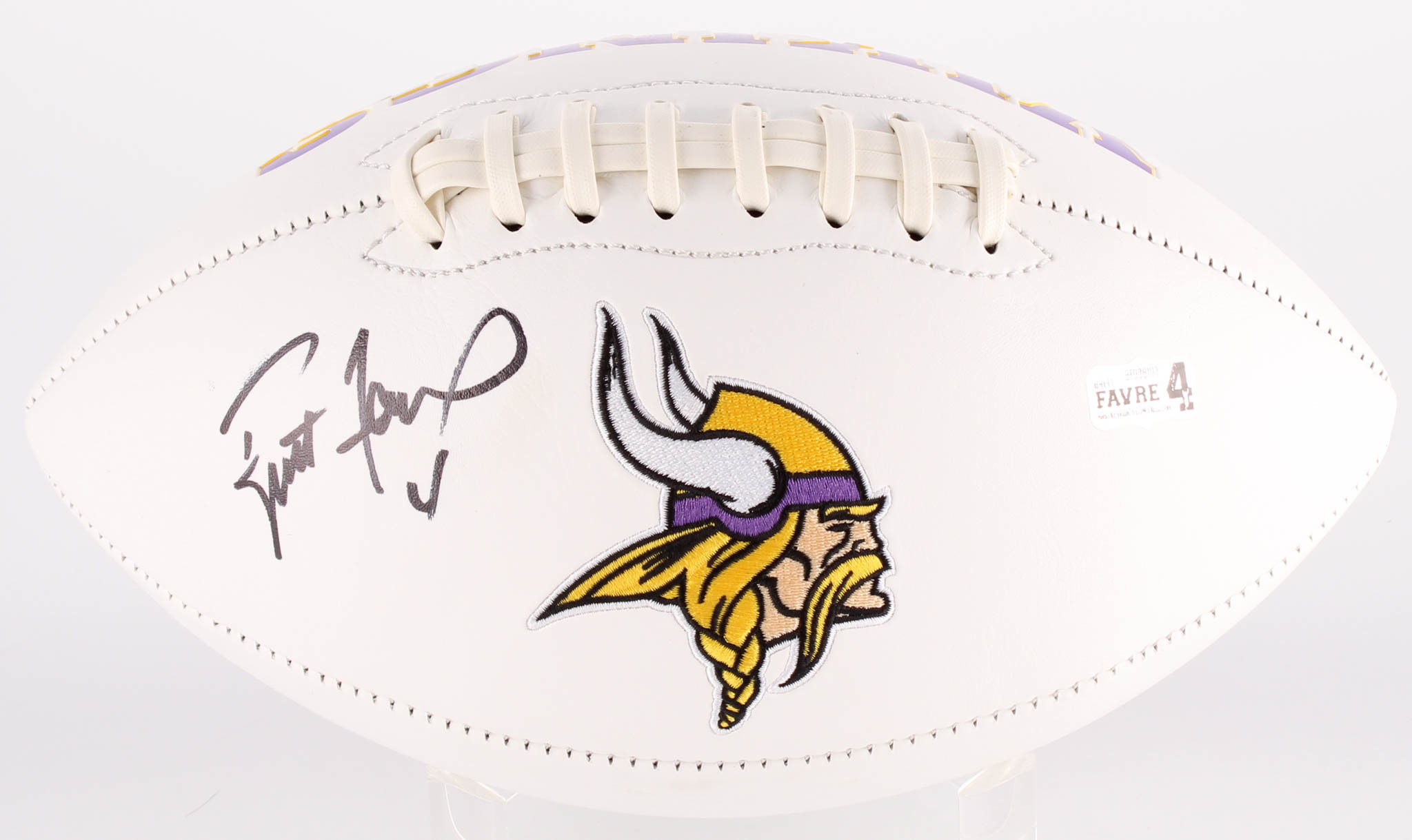 Minnesota Vikings logo football. Hand-signed in black felt-tip pen by Brett Favre (HOF).