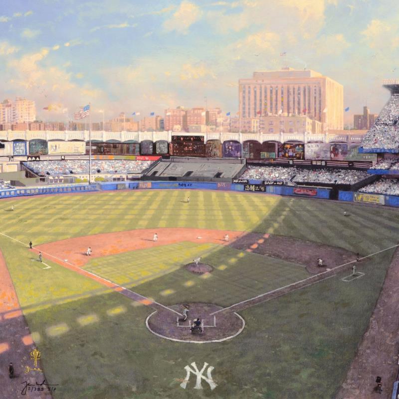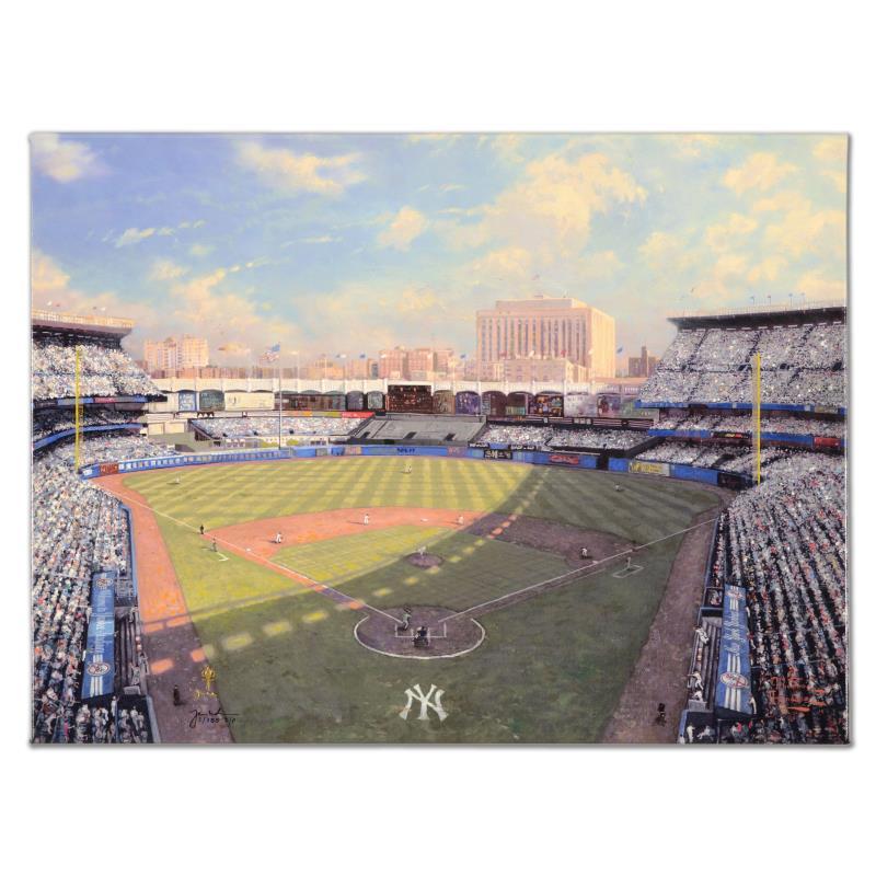 "Yankee Stadium" is a limited edition hand embellished giclee on stretched canvas by Thomas Kinkade (1958-2012), numbered and bearing Kinkade's authorized signature. Includes Certificate of Authenticity. Measures approx. 24" x 18" (image).
