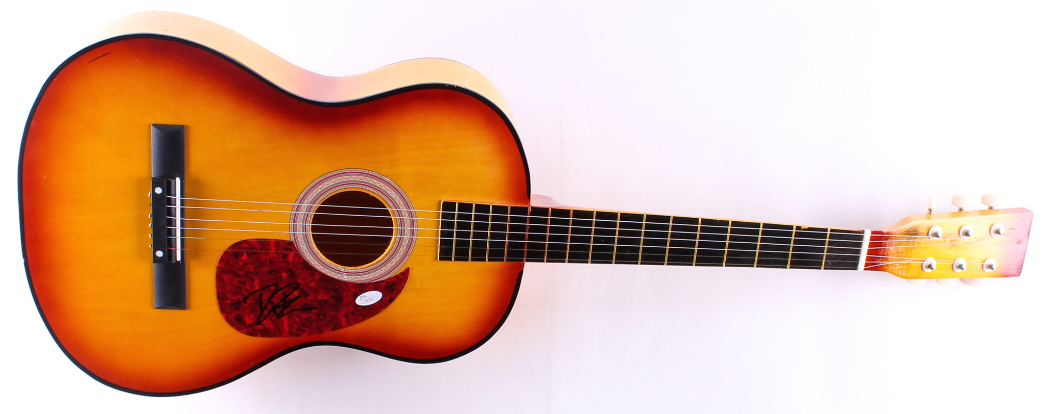 Full-size acoustic guitar measures 38" in length and has been hand-signed in black felt-tip pen by Dierks Bentley. This guitar is a display guitar. It is a full size guitar but is a lower tier version and is not the same quality as one that a musician would play. Please note, guitar has minor scratch on body.