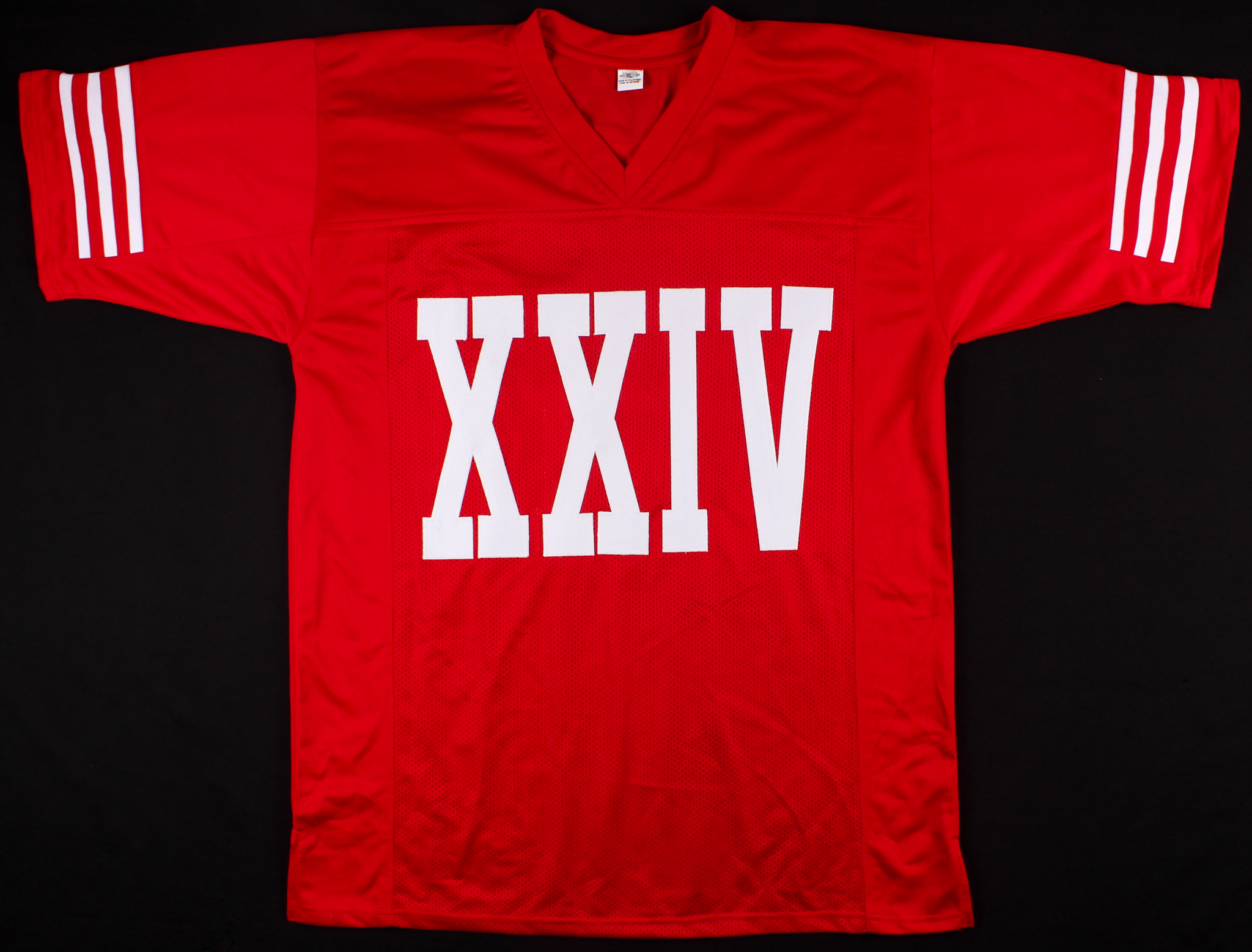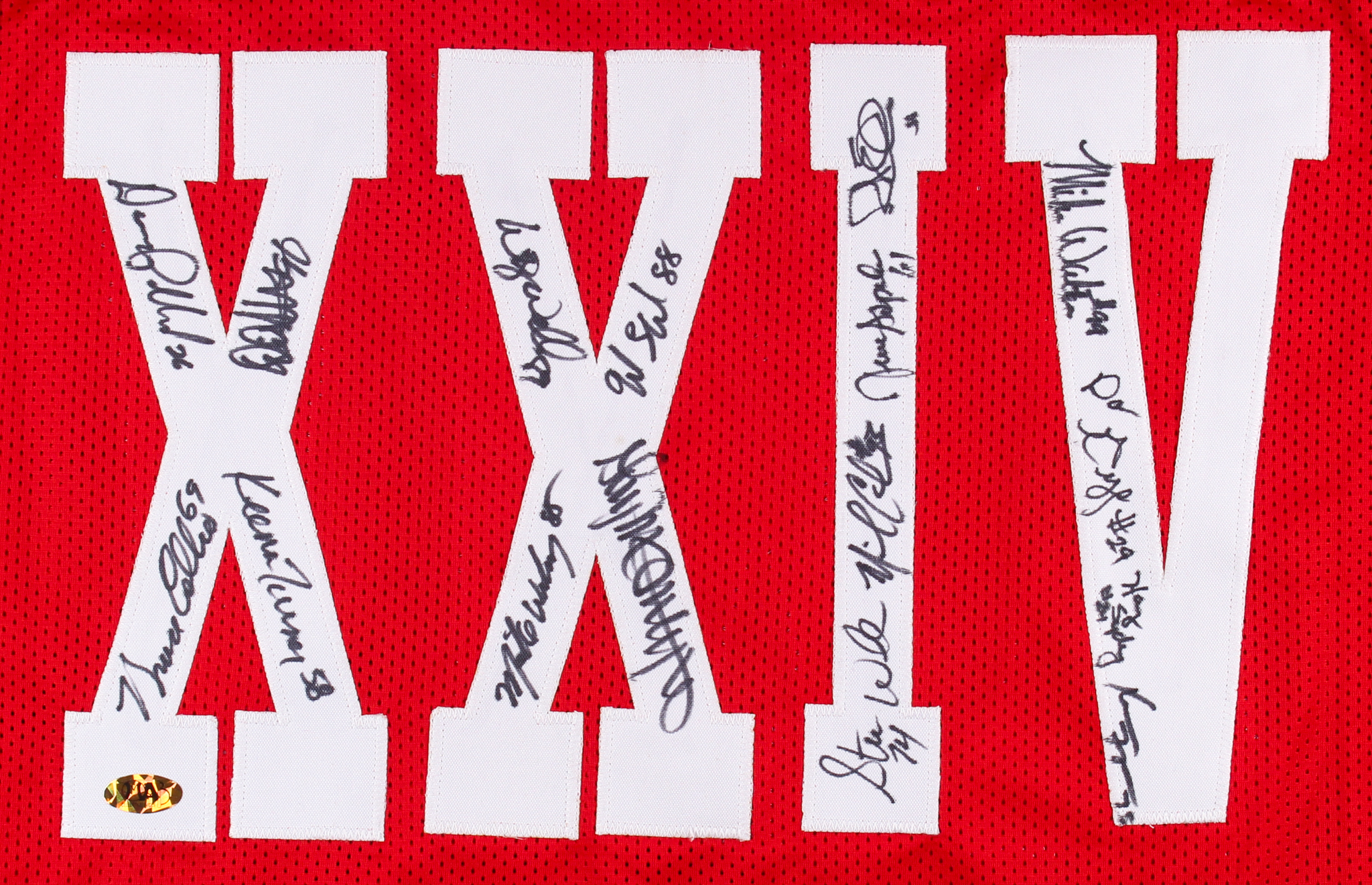 Custom on-field style jersey. Everything sewn on, size XL. Hand-signed in black felt-tip pen by (16) members of the 1989-90 San Francisco 49ers including Bruce Collie, Keena Turner, Darryl Pollard, Wesley Walls, Steve Wallace, Mike Walter, Don Griffin, Harry Sydney, Kevin Fagan, and (7) others.