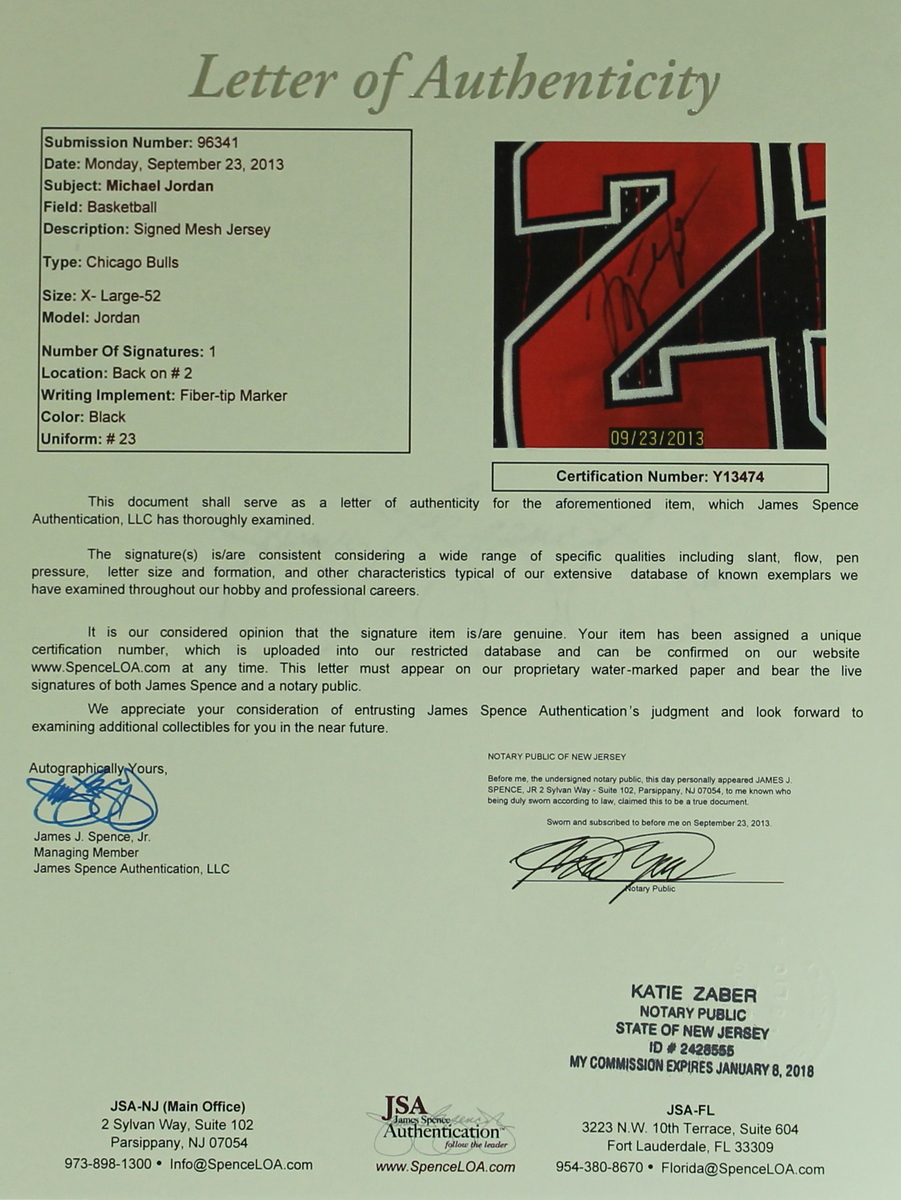 Nike on-court style jersey. Everything sewn on, size 52. Hand-signed in black felt tip pen. The autograph includes an official James Spence Authentication (JSA) hologram and matching LOA for authenticity purposes.