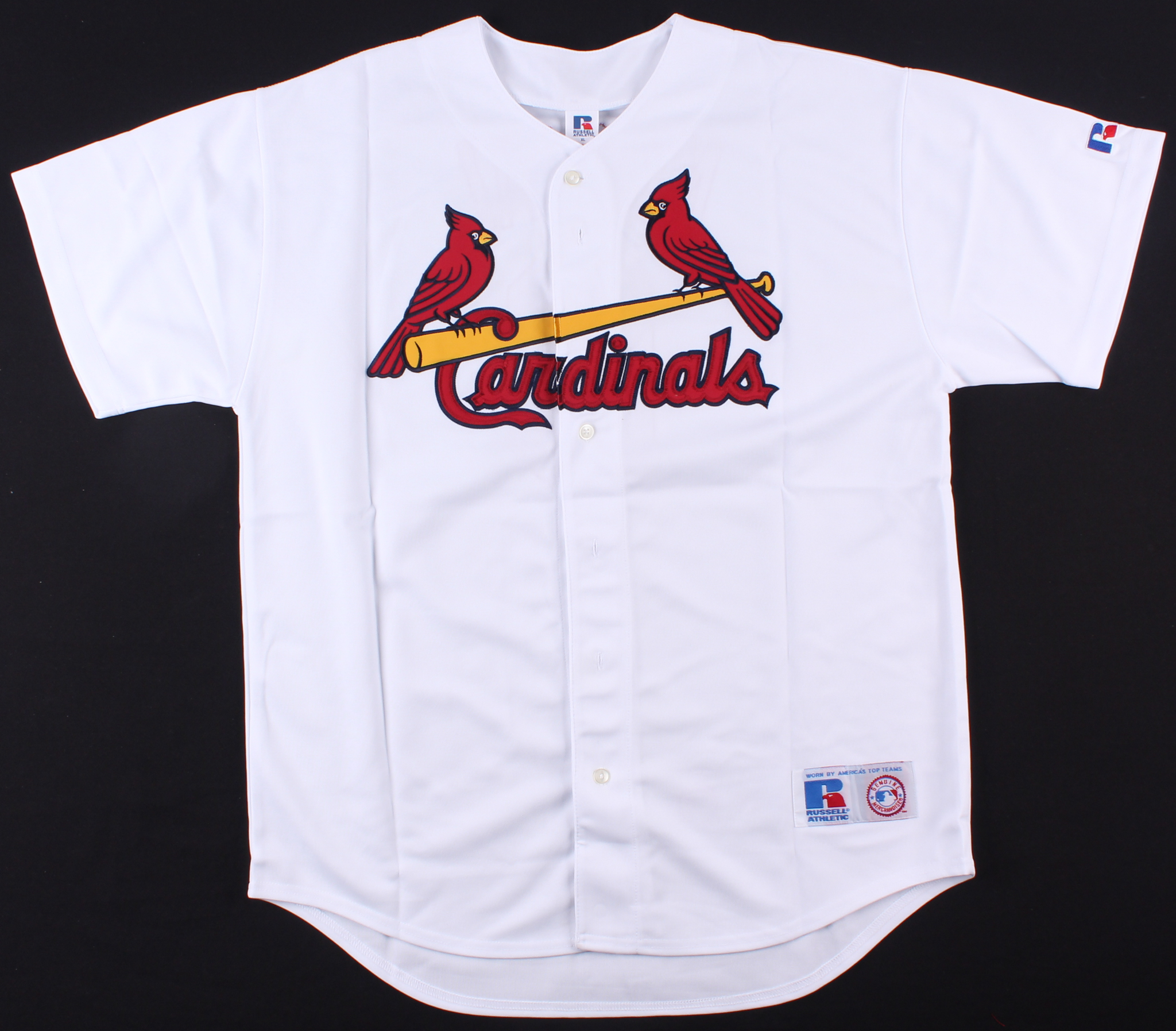 Russell Athletcis on-field style jersey. Everything is sewn on, Size XL. Hand-signed in silver paint pen by Stan Musial (D.2013, HOF).
