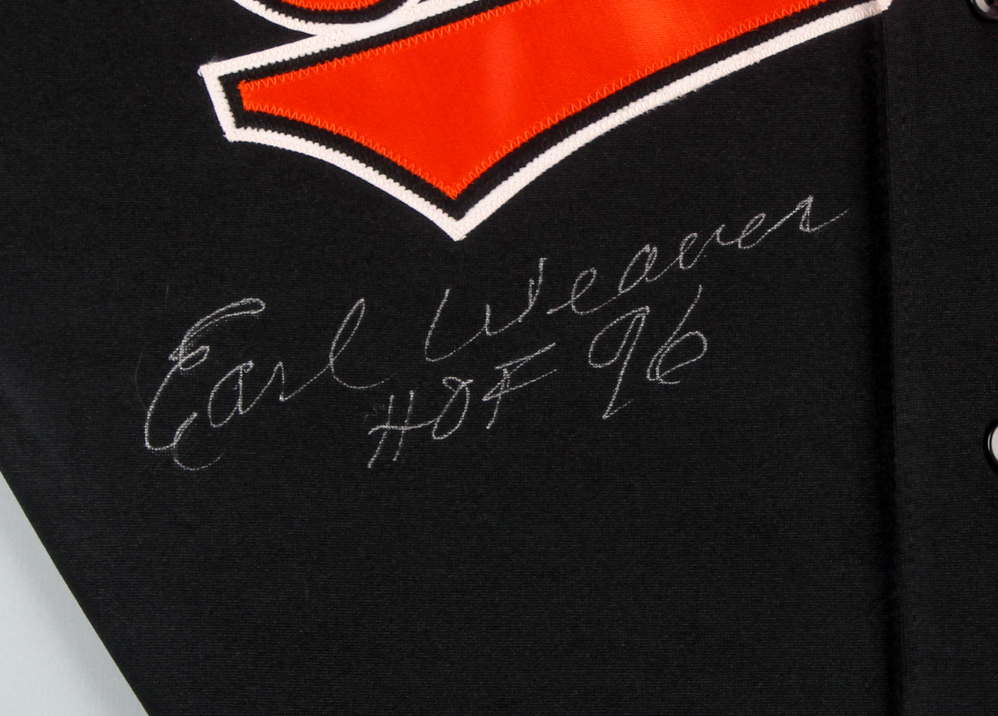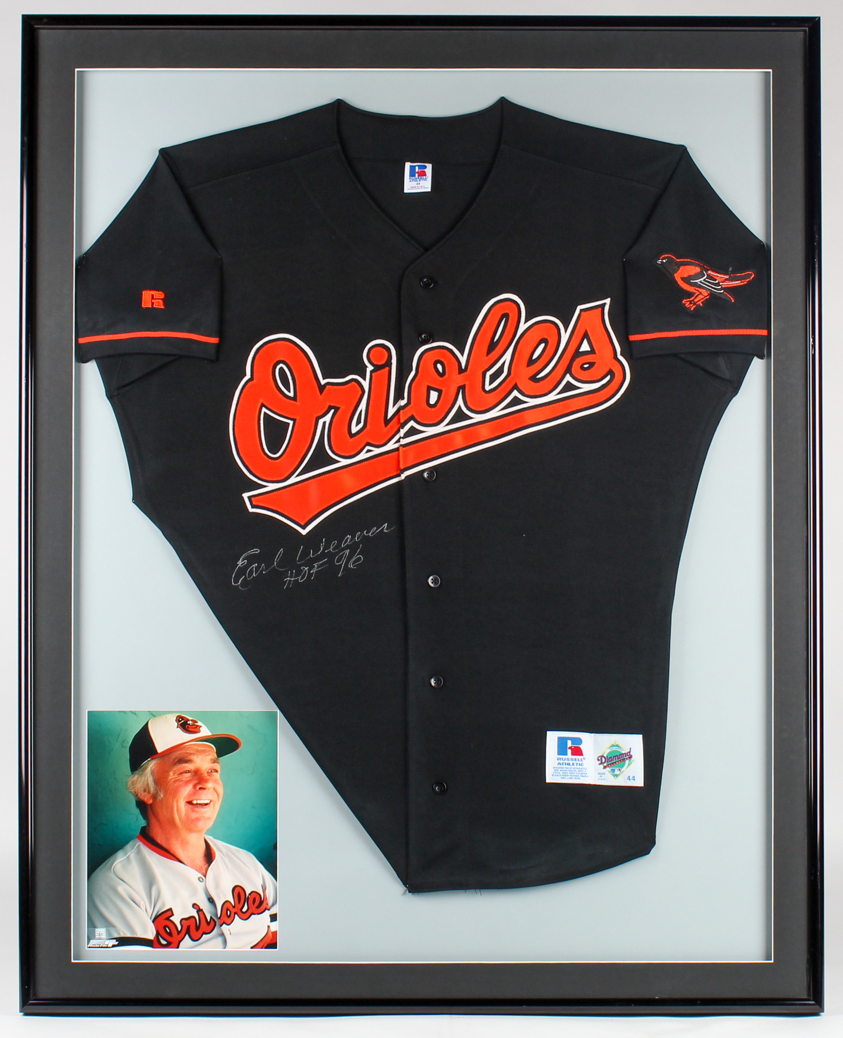 Custom framed display measures 32.5" x 40.5" in size. Features a Russell Diamond Collection Orioles Jersey, size 40, which has been hand-signed and inscribed in silver paint pen by Earl Weaver (D. 2013, HOF). Please note, the frame shows minor signs of wear.
