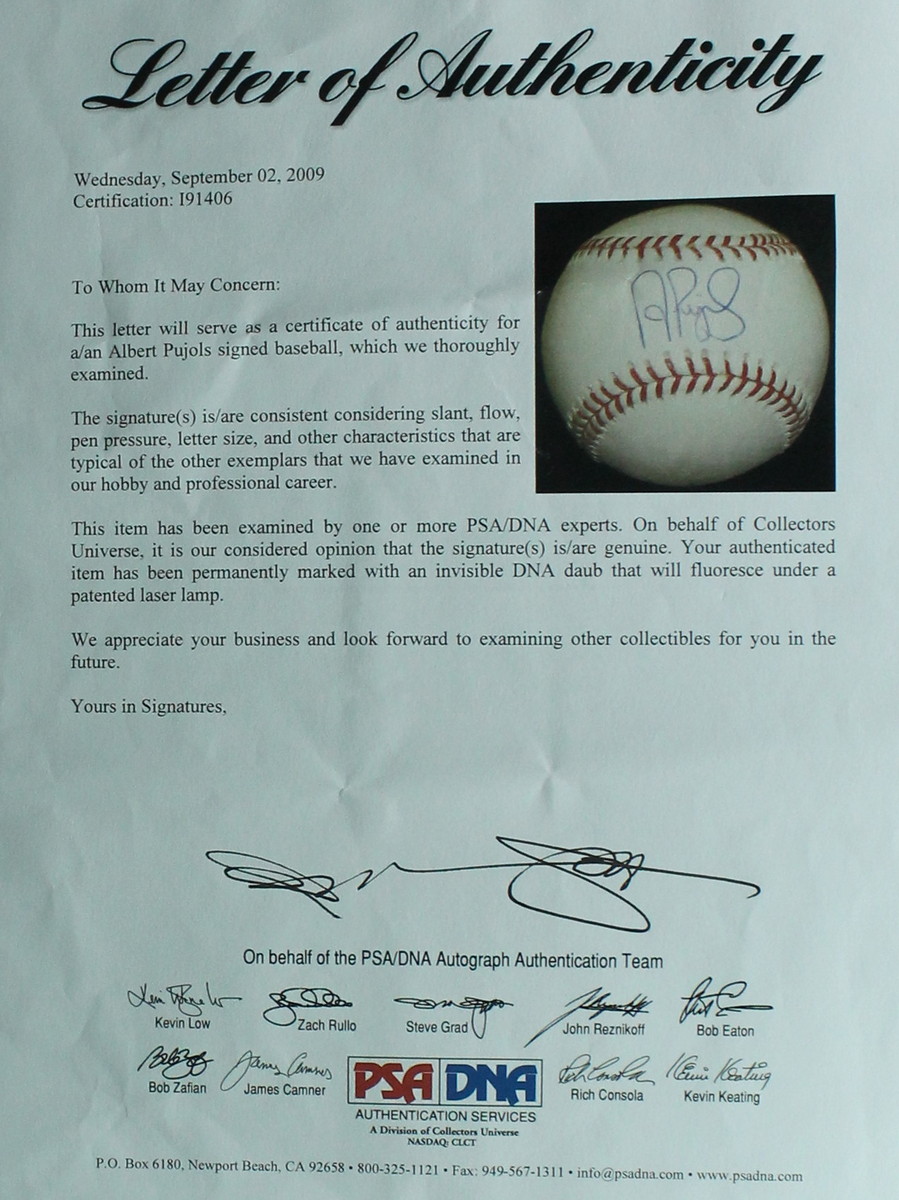 Official Major League Baseball hand-signed on the sweet spot in blue ink by Albert Pujols (Cardinals, Angels). The autograph includes an official PSA/DNA hologram and matching LOA for authenticity purposes.