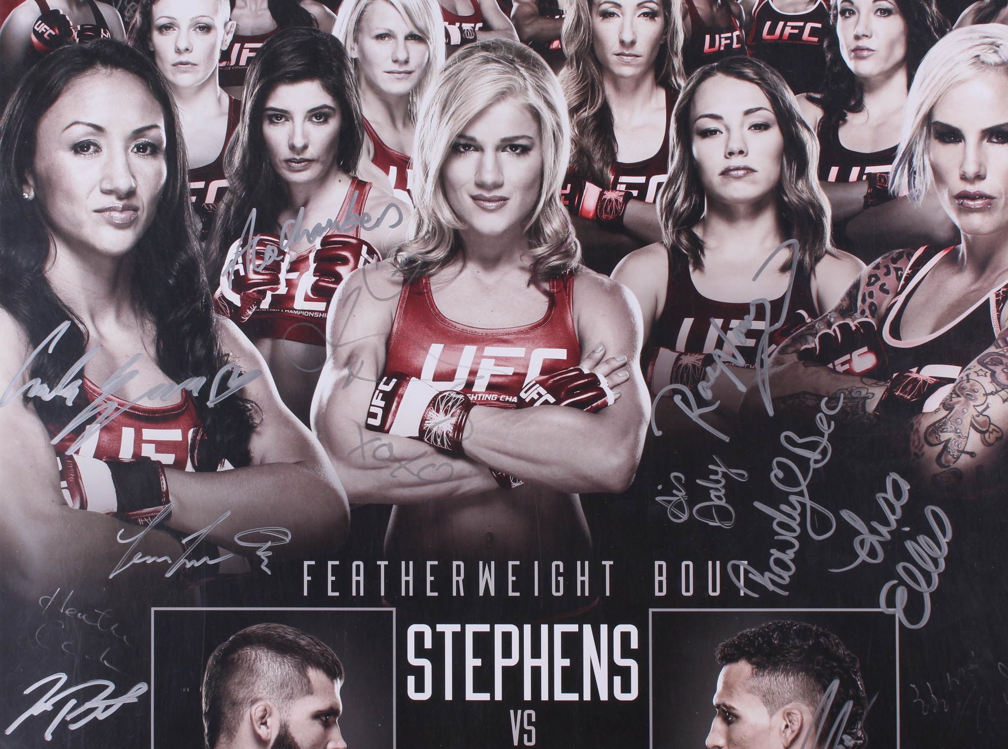 UFC poster measures 27" x 38" and has been hand-signed in silver paint pen by (21) fighters including Carla Esparza, Rose Namajunas, Lisa Ellis, Jeremy Stephens, Charles Oliveira, Jessica Penne, Randa Markos, Alex Chambers, Aisling Daly, Angela Hill, and others. Please note the poster shows signs of wear and creasing.
