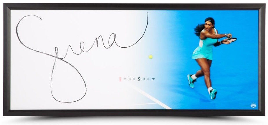 Display measures 20" x 46" in size. Hand-signed in black felt-tip pen by Serena Williams