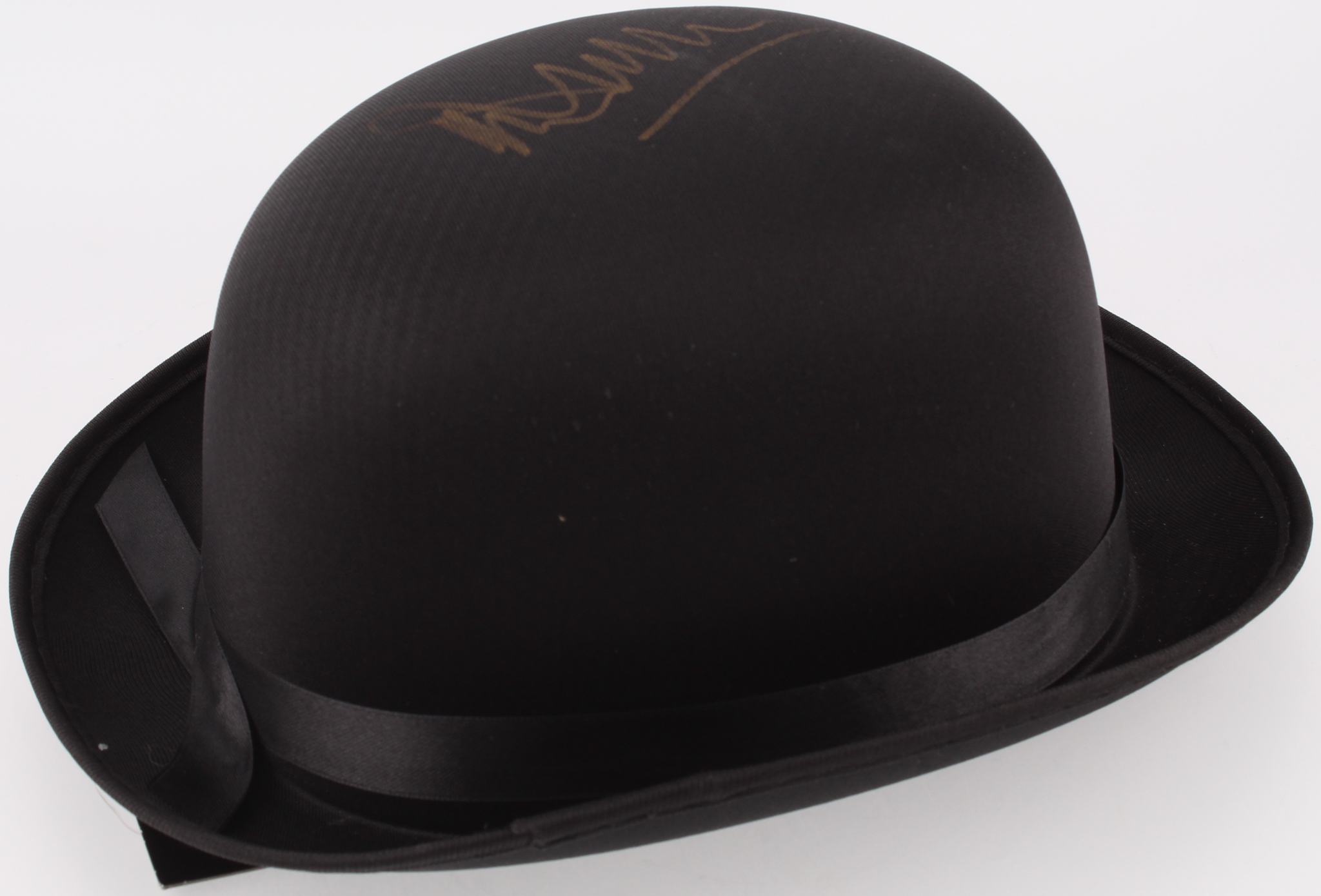 Prop bowler hat has been hand-signed in gold paint pen by Malcolm McDowell.