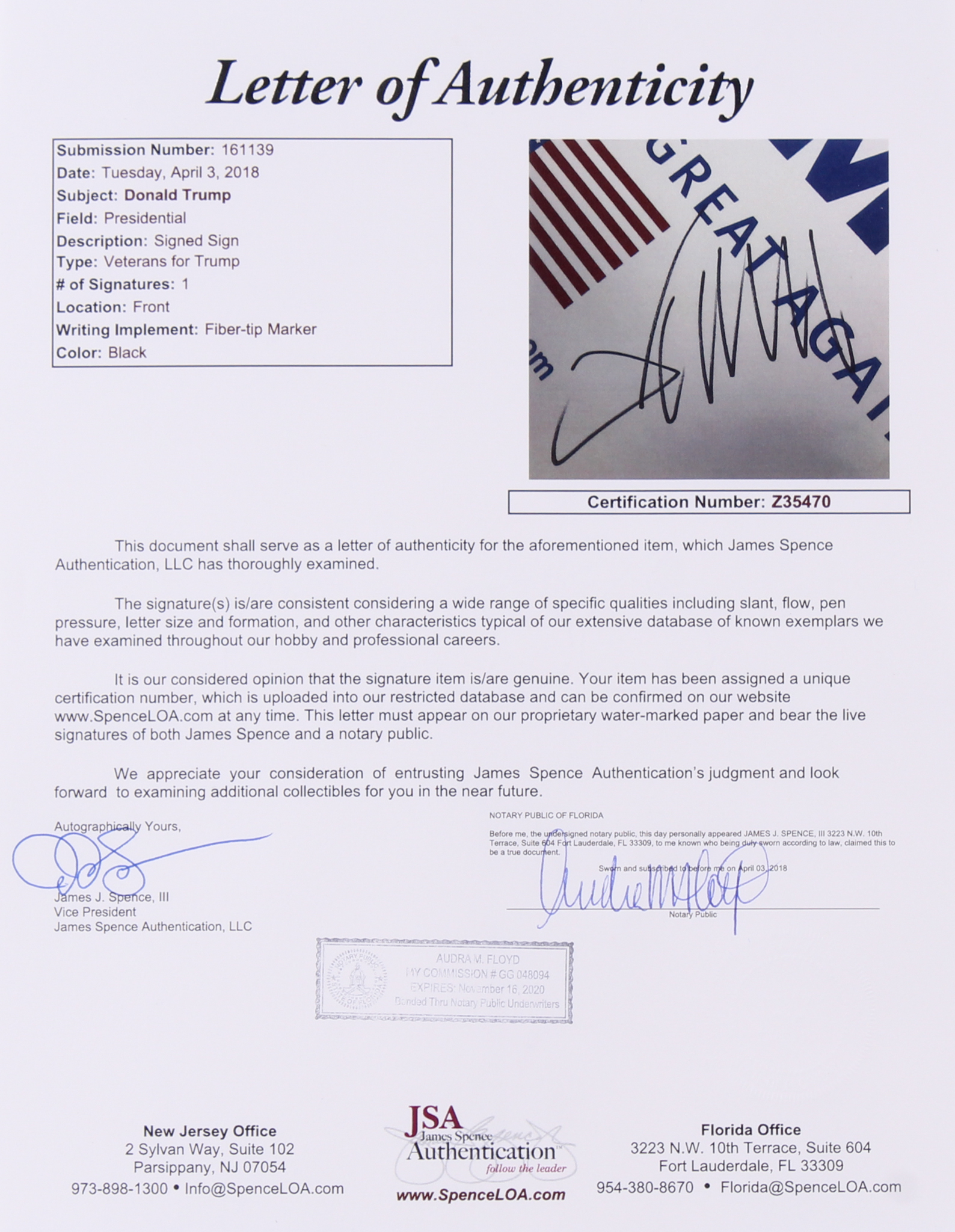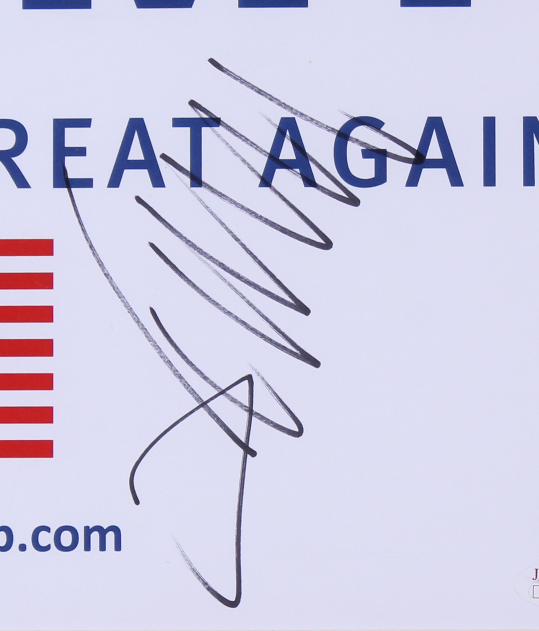Custom framed campaign sign measures 22" x 28" in size and has been hand-signed in black felt-tip pen by Donald Trump.