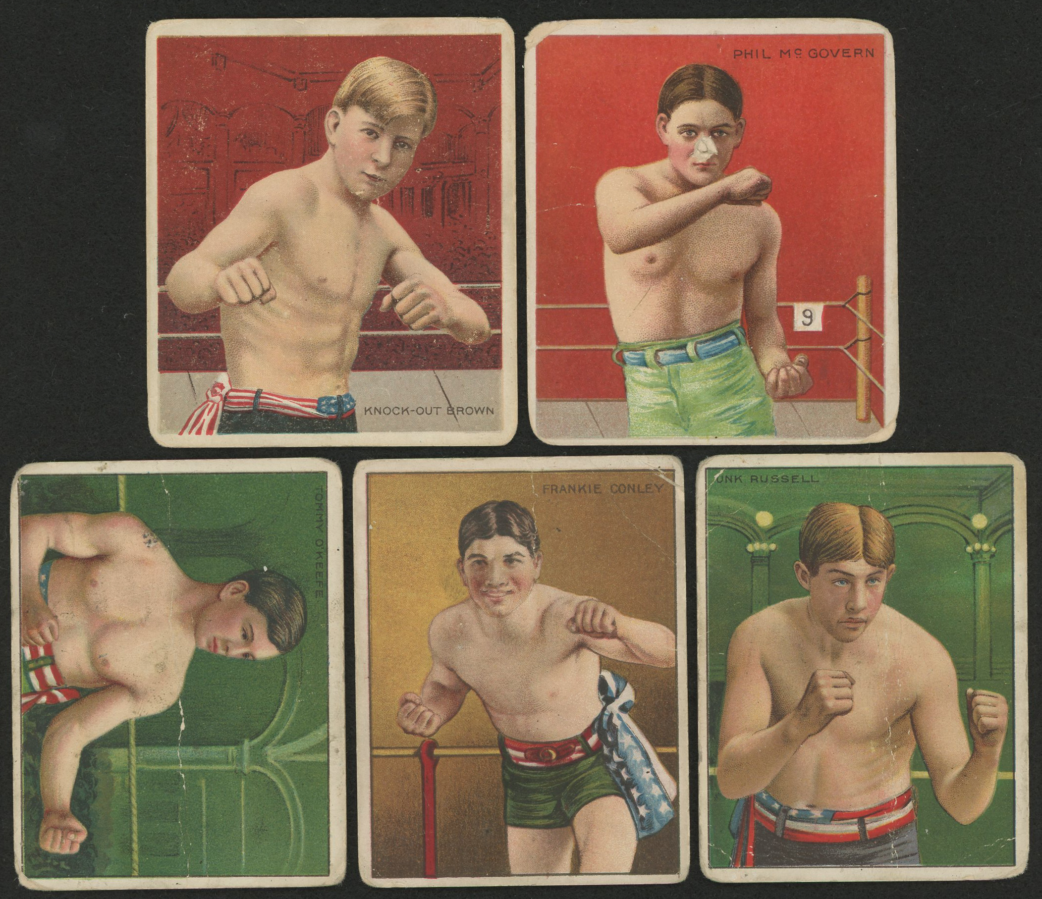 Lot of (5) Vintage 1910 Boxer Cards with T219 Champion Pugilists #5 Frankie Conley, T219 Champion Pugilists #41 Unk Russell, T219 Champion Pugilists #38 Tommy O'Keefe, T218 Mecca Champions #129 Phil McGovern Boxing, T218 Mecca Champions #95 Knock-Out Bro