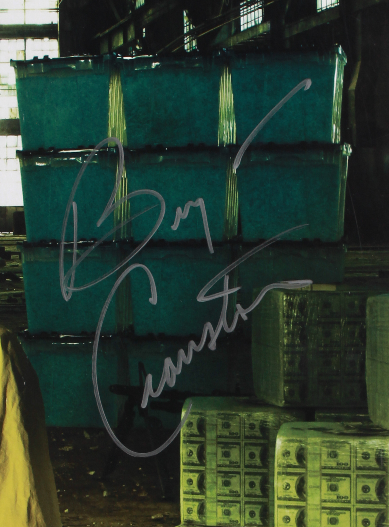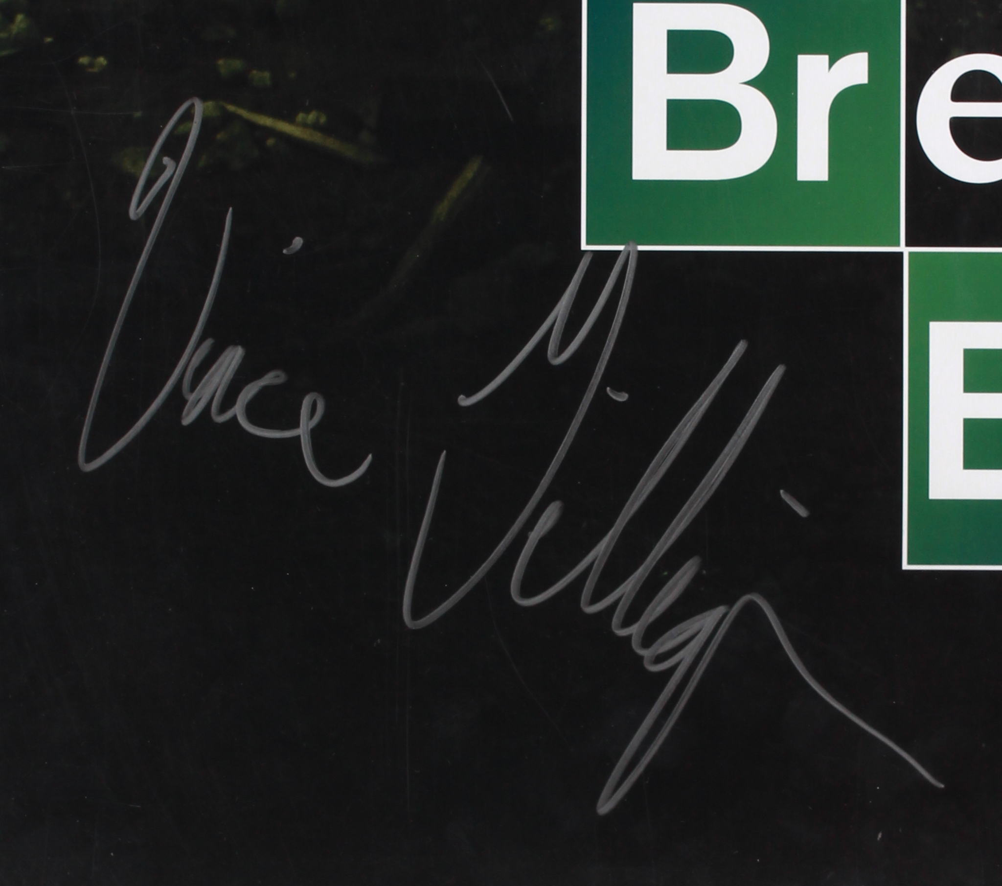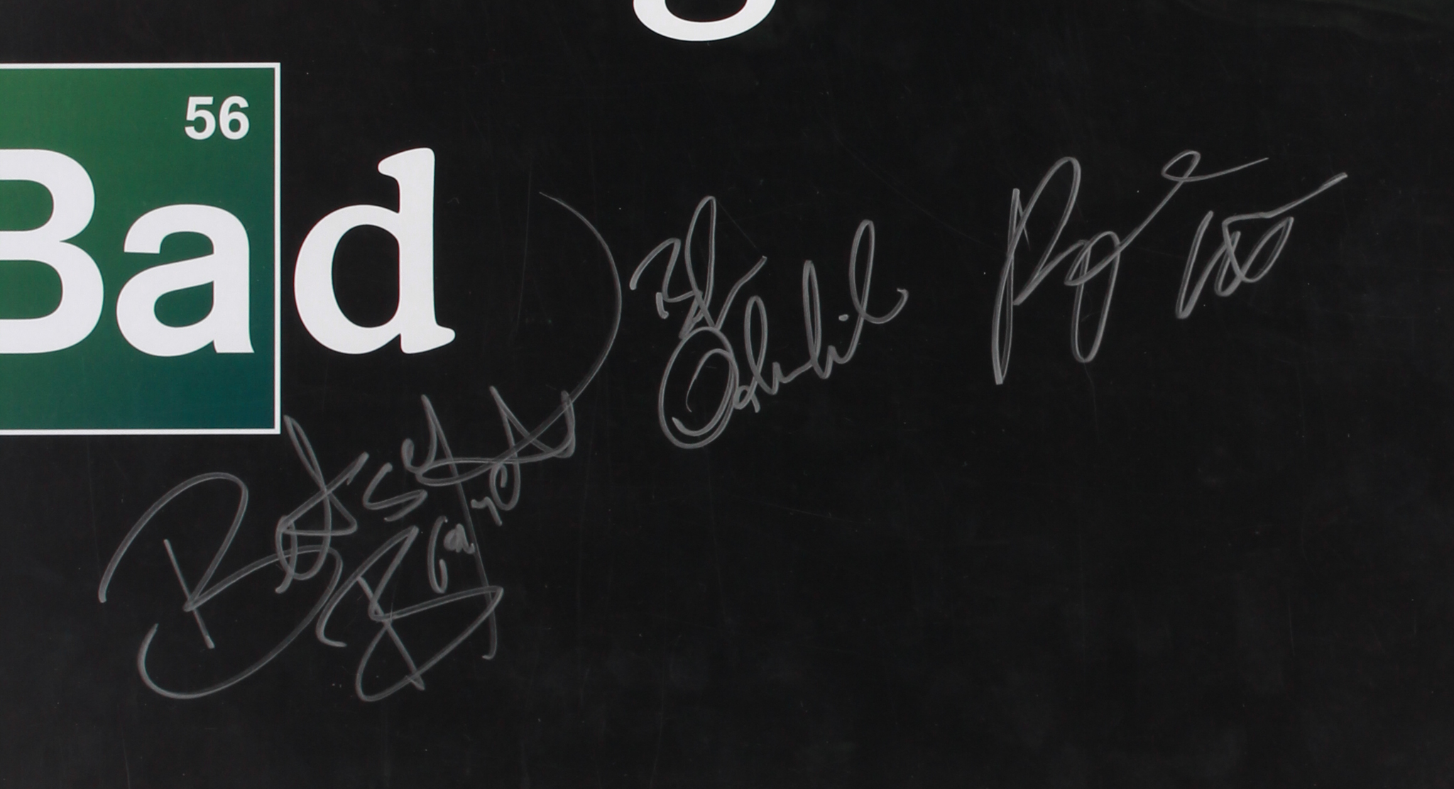 Poster measures 27" x 40" in size and is hand-signed and in silver paint pen by (5) including Vince Gilligan, Bryan Cranston (Walter White), Bob Odenkirk (Saul Goodman), Betsy Brandt (Marie Schrader), and Roy Frank "RJ" Mitte (Walter White, Jr.).