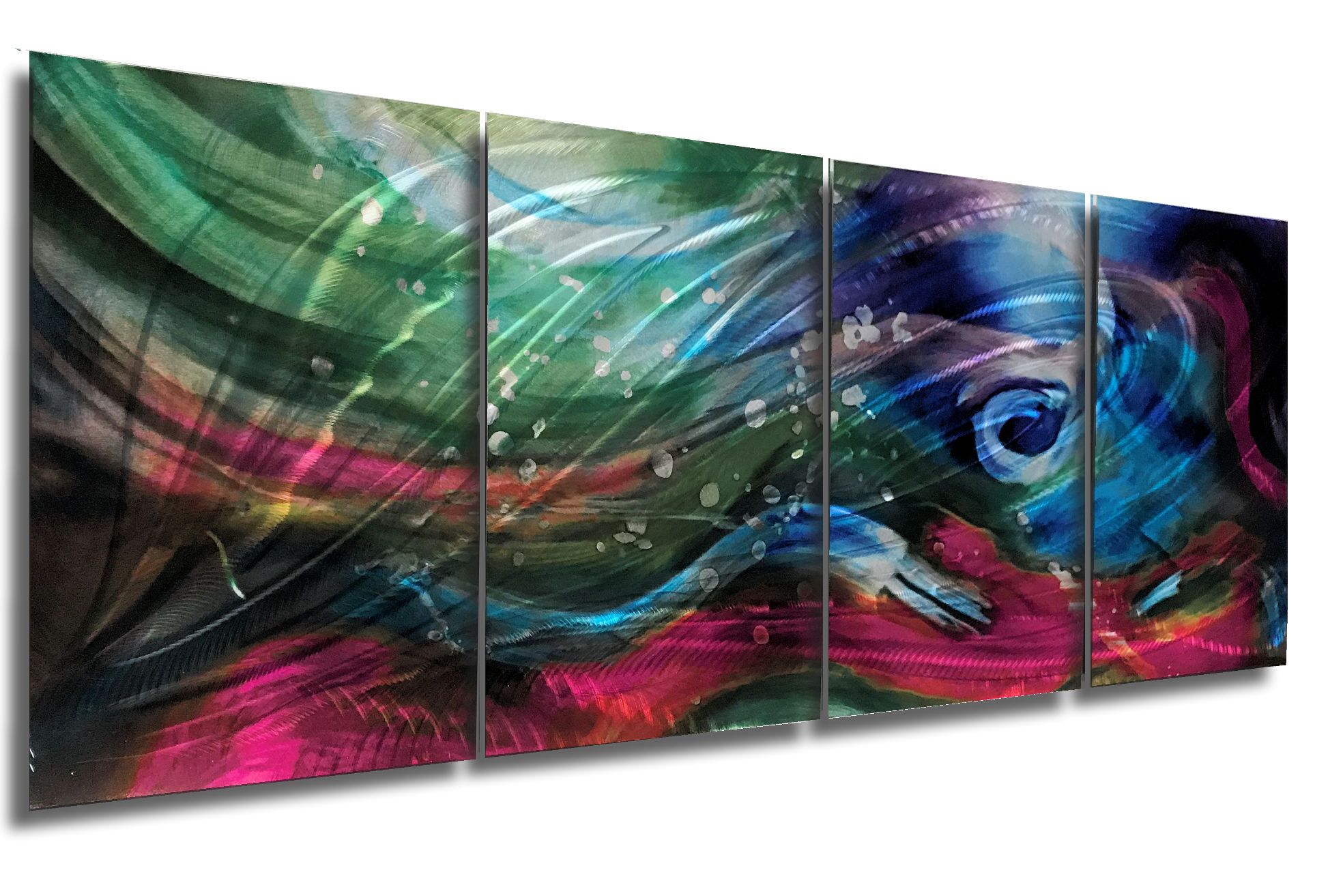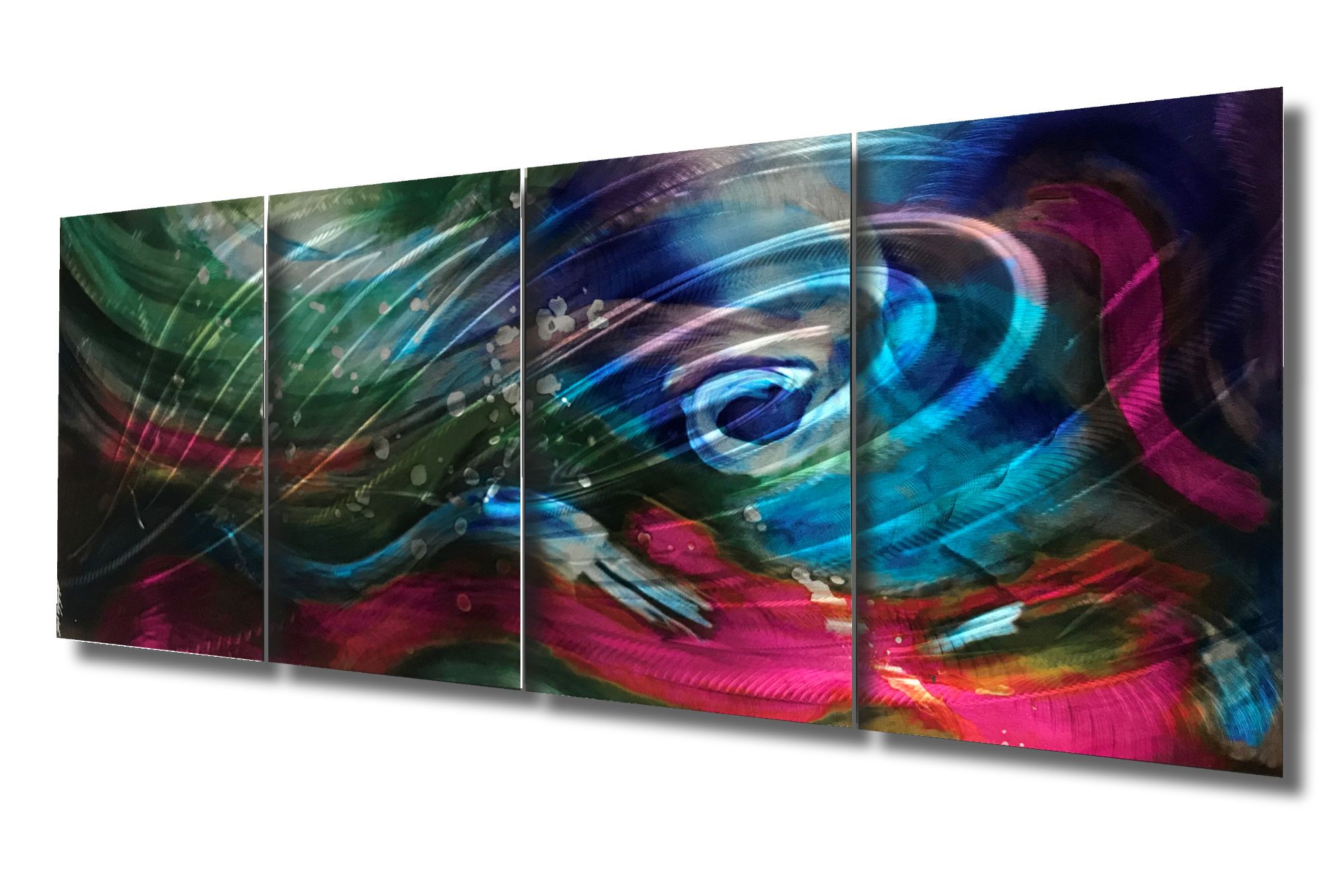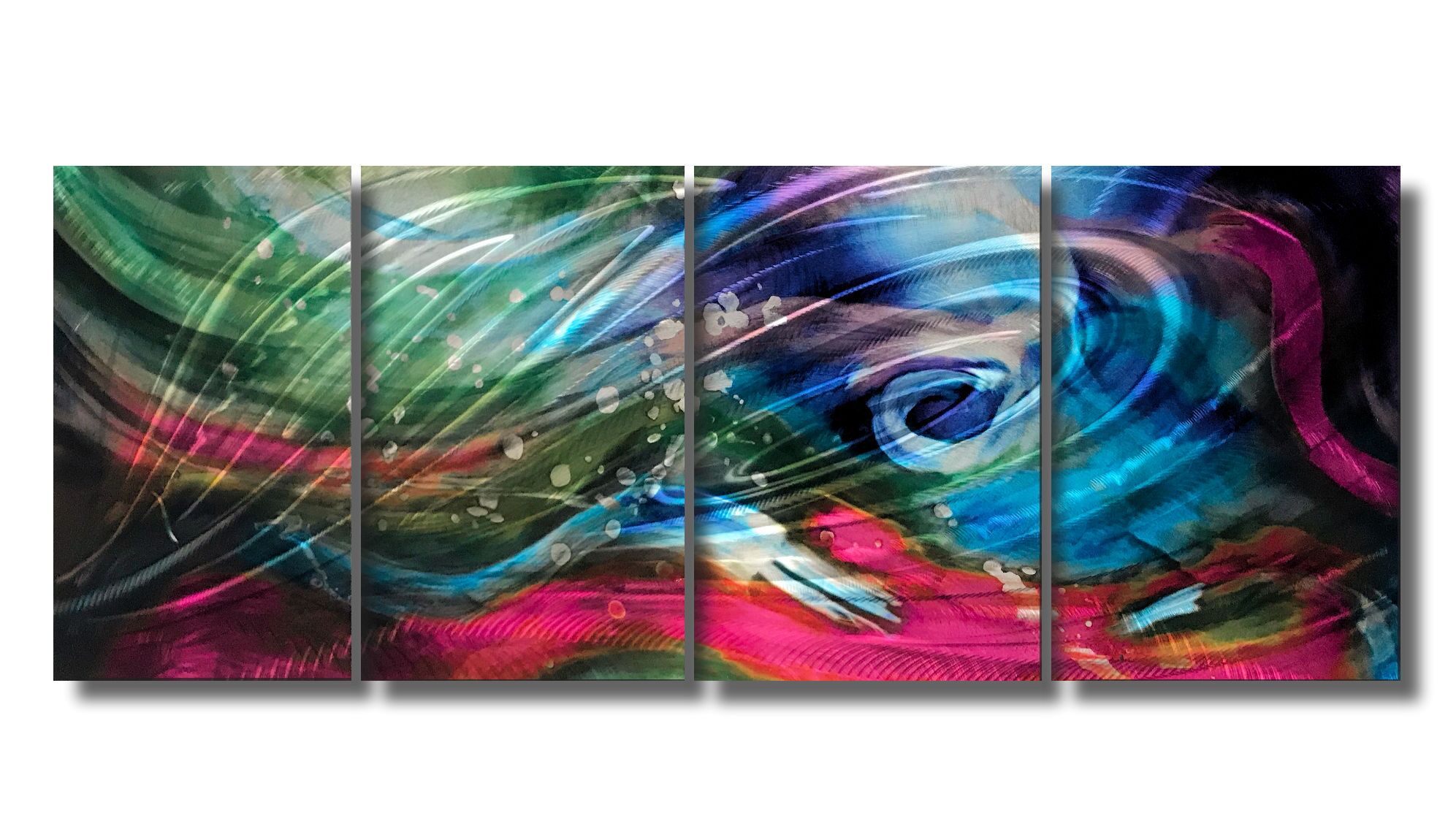 "Esne X6" measures approximately 24" x 60" x 1" in size. Hand-signed by original artist Nicholas Yust. The material used is ground, colored and cleared aluminum with a hand-ground texture, acrylic coloring, and hand-layered clear coat. Each of the 4 panels hangs individually.