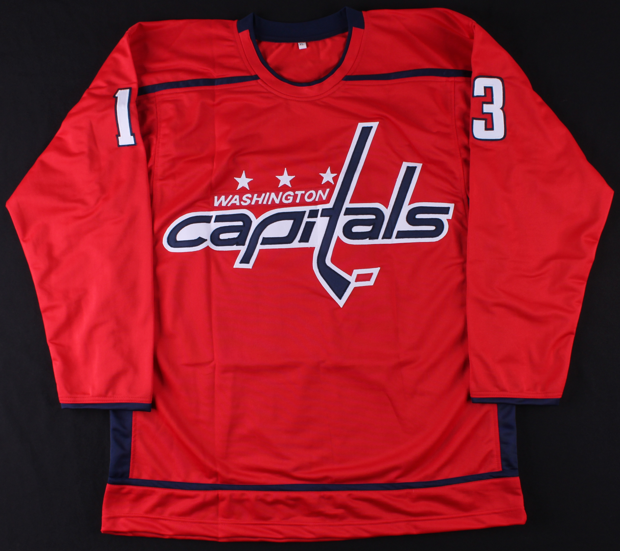 Custom on-ice style jersey. Everything is sewn on, size XL. Hand-signed in black felt tip pen by Jakub Vrana.