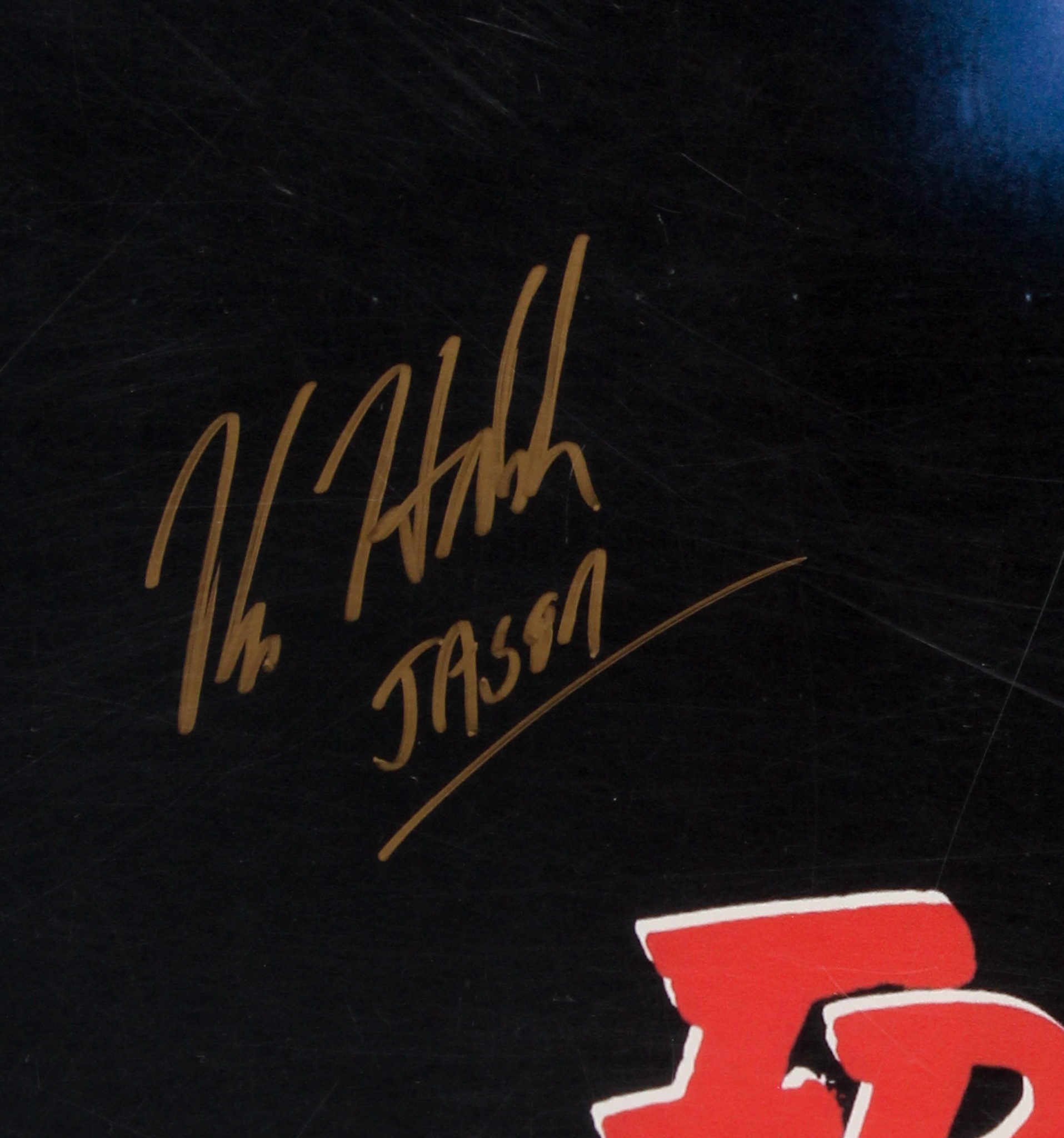 Movie poster measures 27" x 40" in size and has been hand-signed and inscribed in gold paint pen by Kane Hodder (Jason) and Lar Park Lincoln (Tina Shepard).