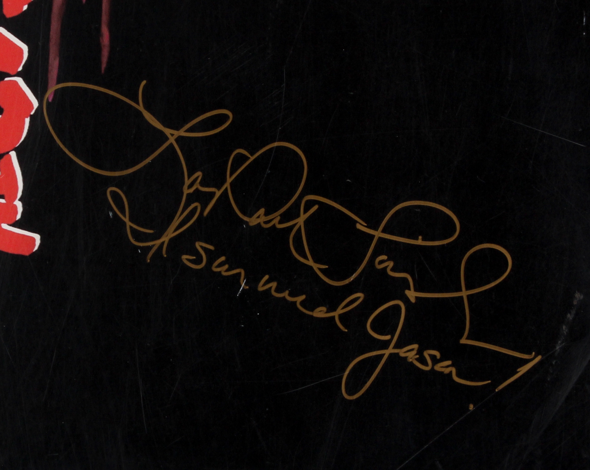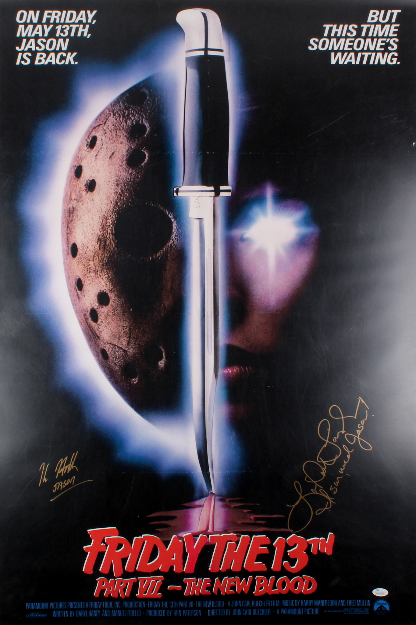 Movie poster measures 27" x 40" in size and has been hand-signed and inscribed in gold paint pen by Kane Hodder (Jason) and Lar Park Lincoln (Tina Shepard).