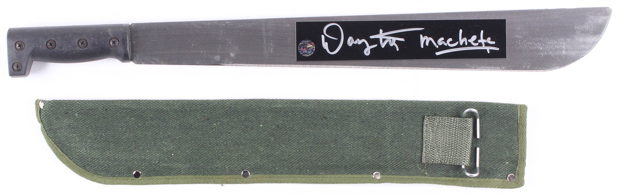 Steel machete measures 23" in size, comes with a canvas sheath, and is hand-signed and inscribed in silver paint pen by Danny Trejo.
