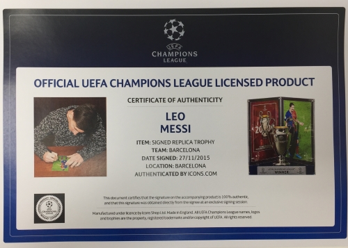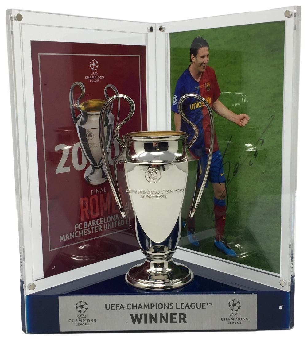 Lionel Messi Signed replica 2006 UEFA Champions League trophy display features an 8" x 10" photo that has been hand-signed in black felt-tip pen by Lionel Messi.