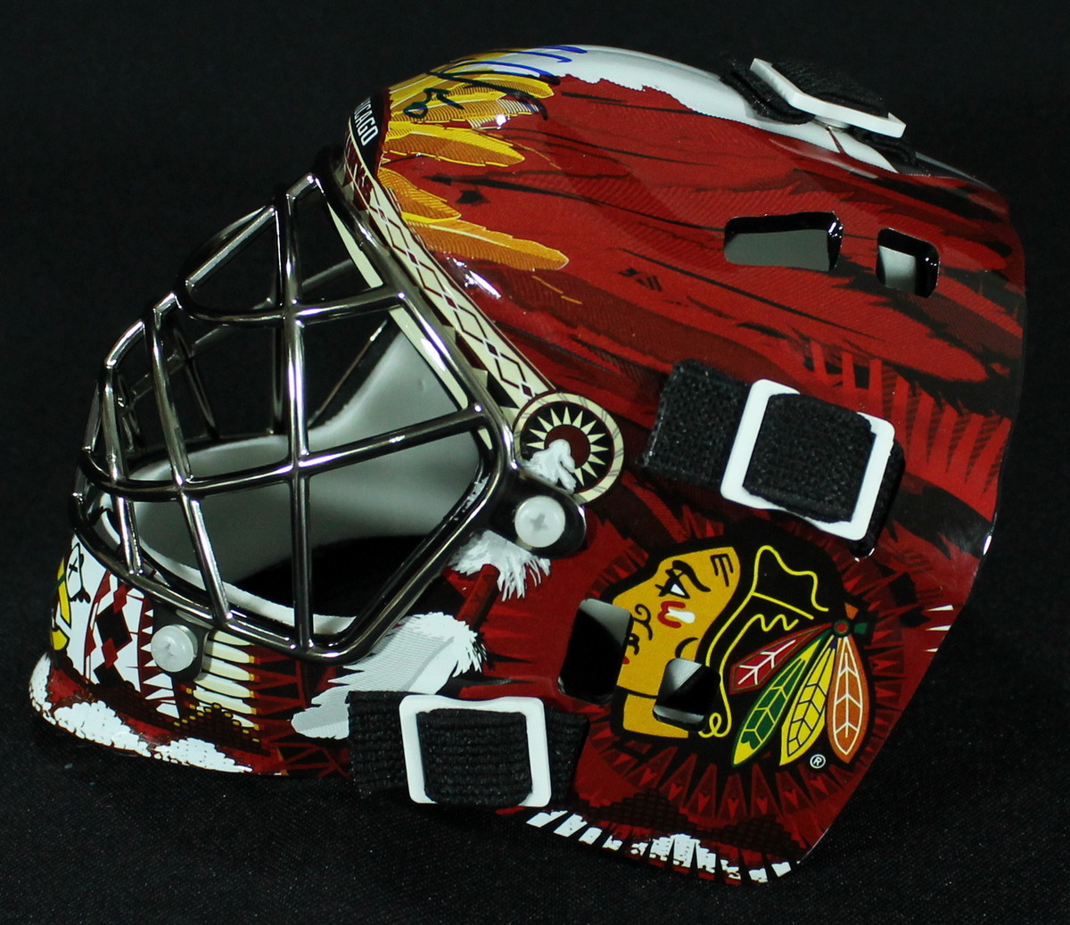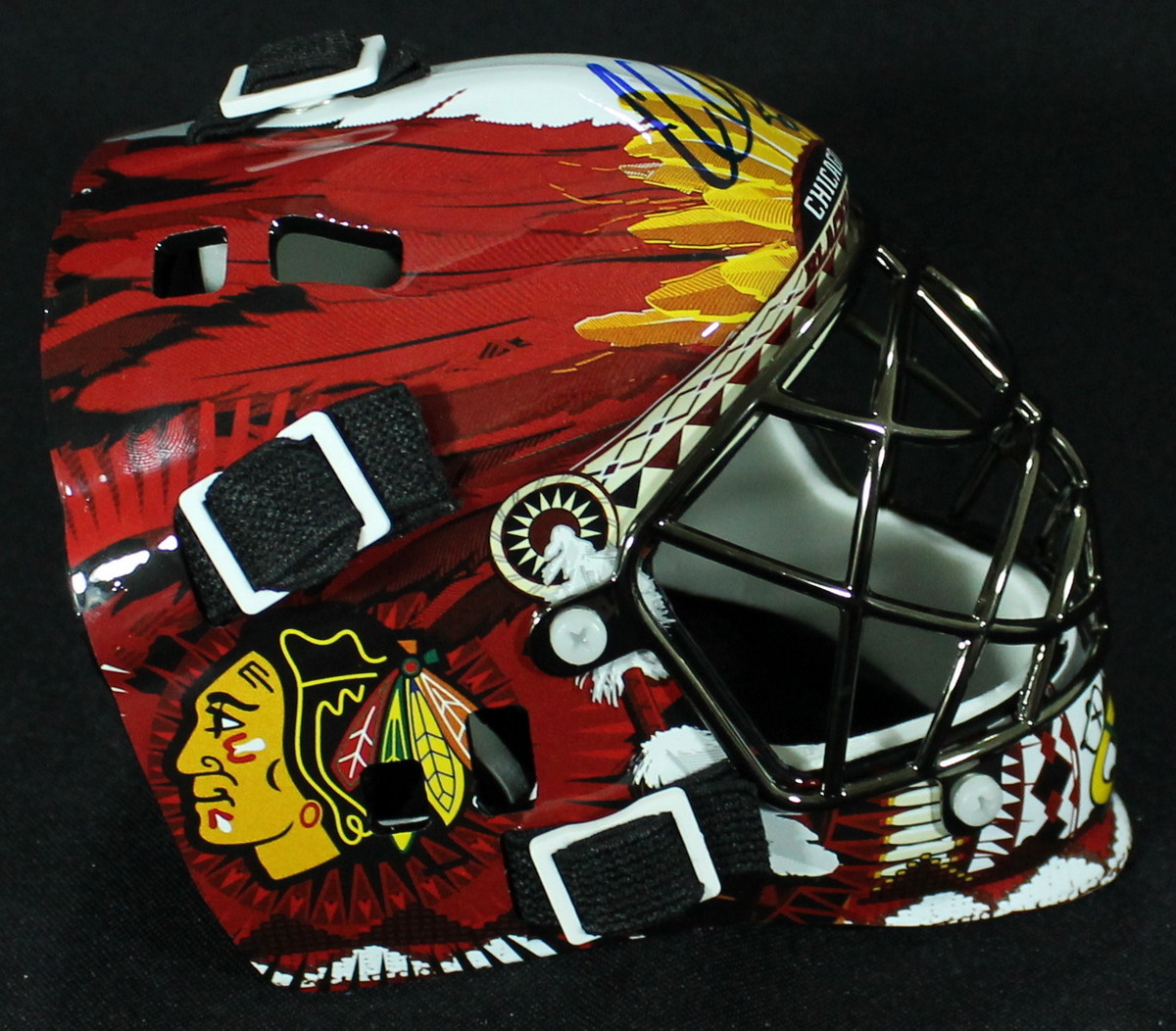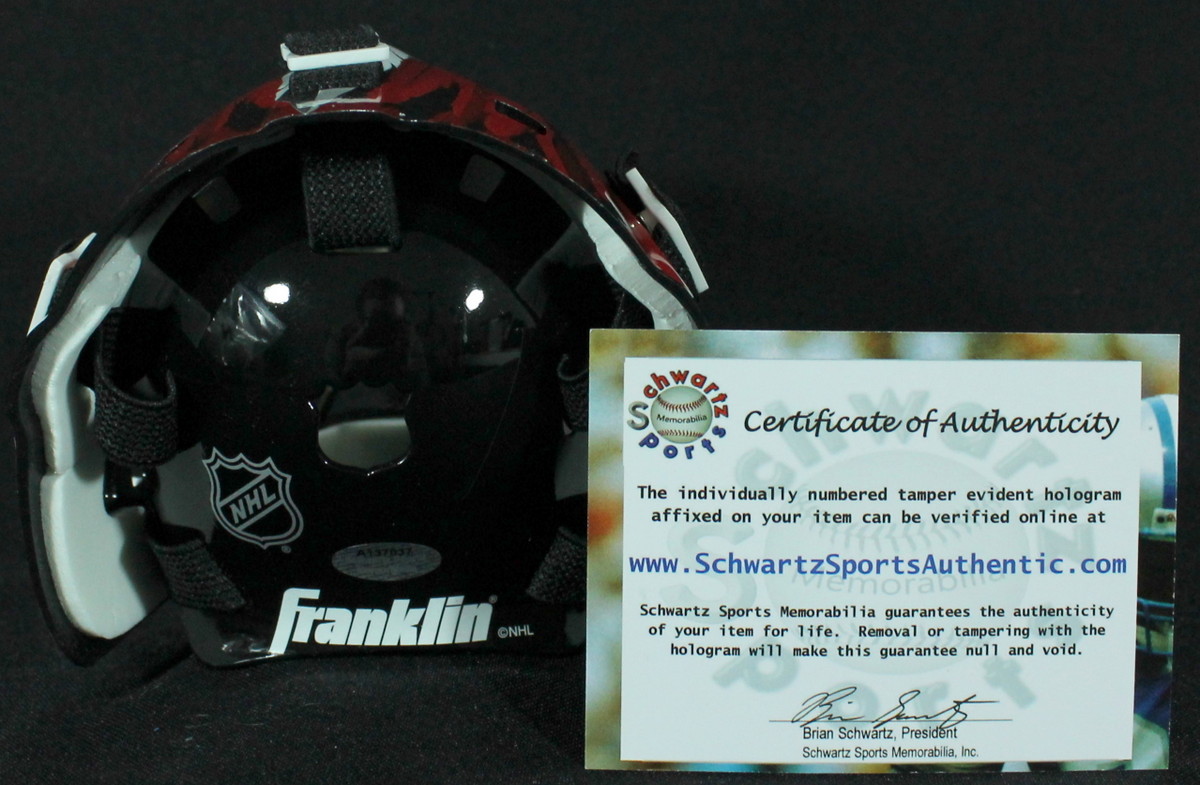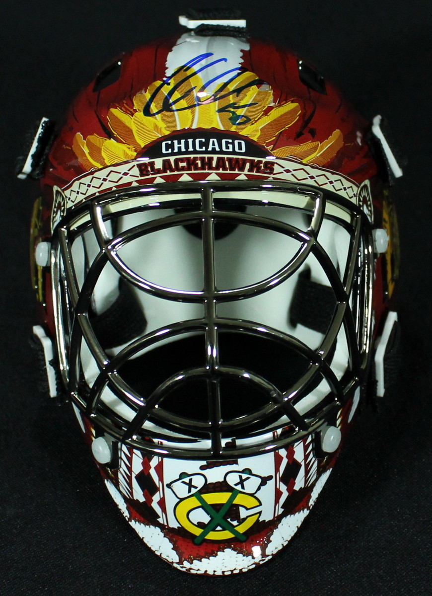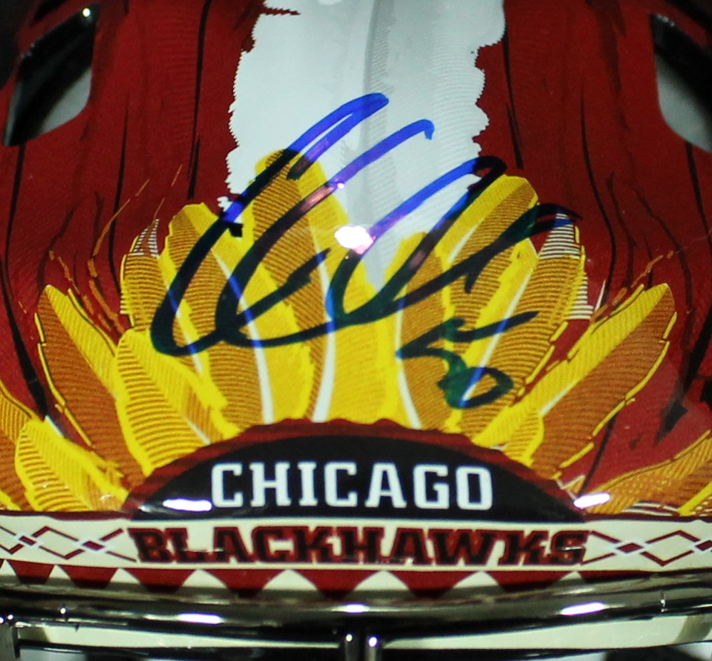 Franklin mini-helmet. Hand-signed in blue felt-tip pen by Corey Crawford. The autograph includes an official Schwartz Sports Hologram and matching COA for authenticity purposes.