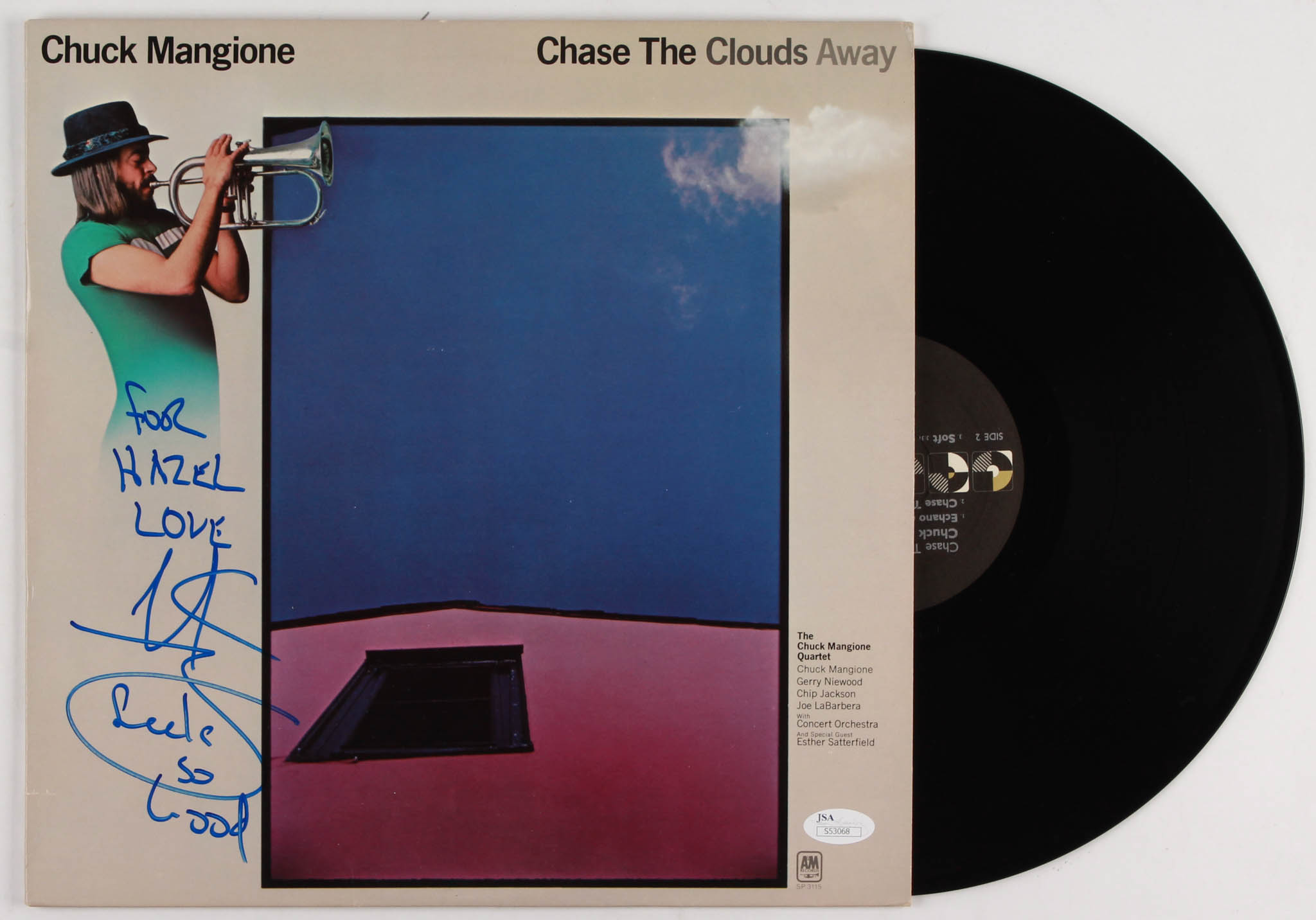 "Chase the Clouds Away" Vinyl Record Album has been hand-signed in blue felt-tip pen by Chuck Mangione. Please note, auction includes vinyl record. Please note that album has been personalized for Hazel.
