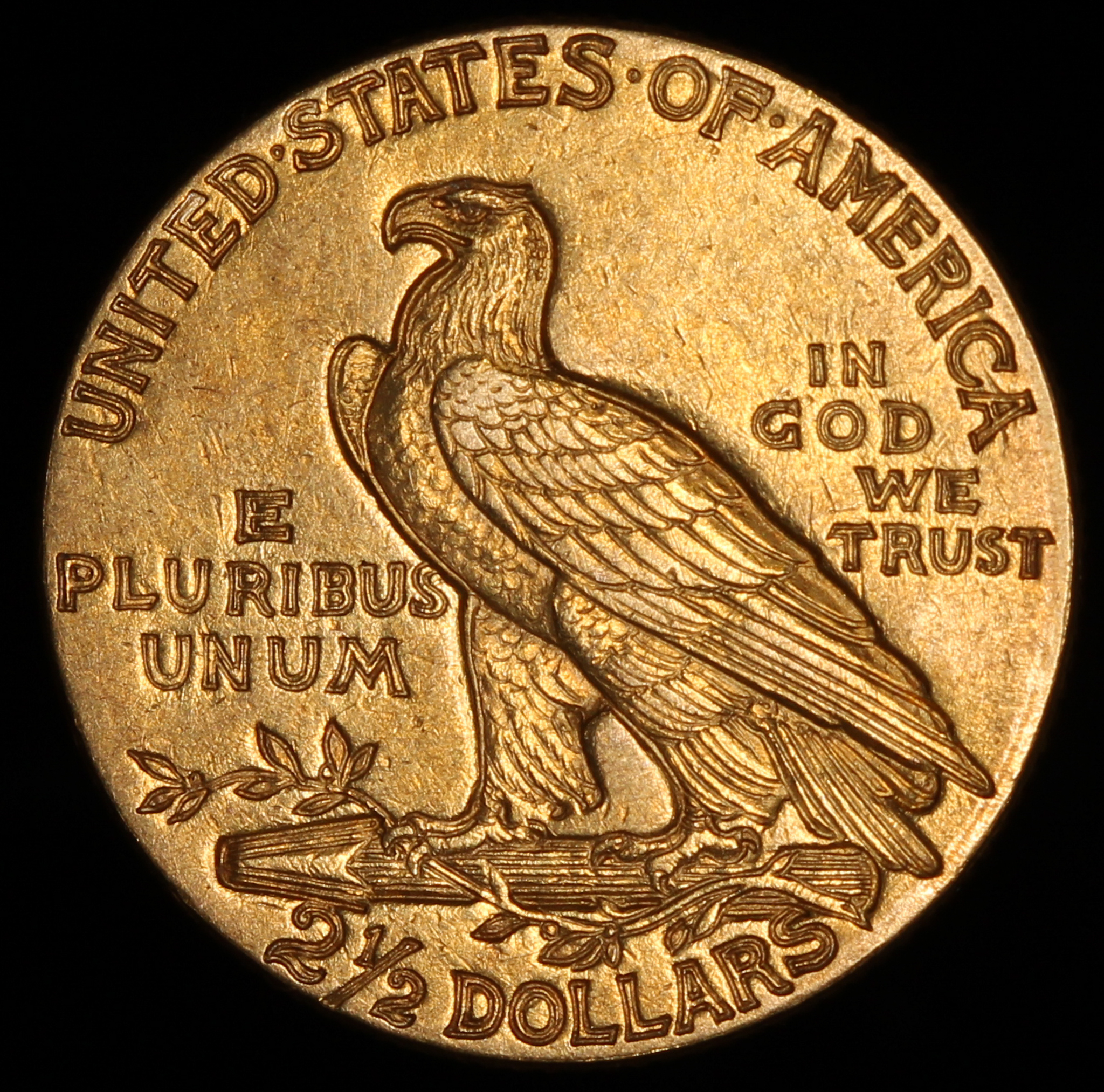 Designed by Bela Lyon Pratt, a student of Augustus Saint-Gaudens, the $2.50 Indian features legends and motifs that are incused rather than raised on the coin, making them one of only two U.S. coins minted in this manner. The obverse features a stoic Indian chief profile, surrounded by 13 small stars and the word "Liberty" along with the date. The reverse shows a regal bald eagle with a cluster of arrows and an olive branch, symbolic of war and peace, beneath the eagle’s talons.