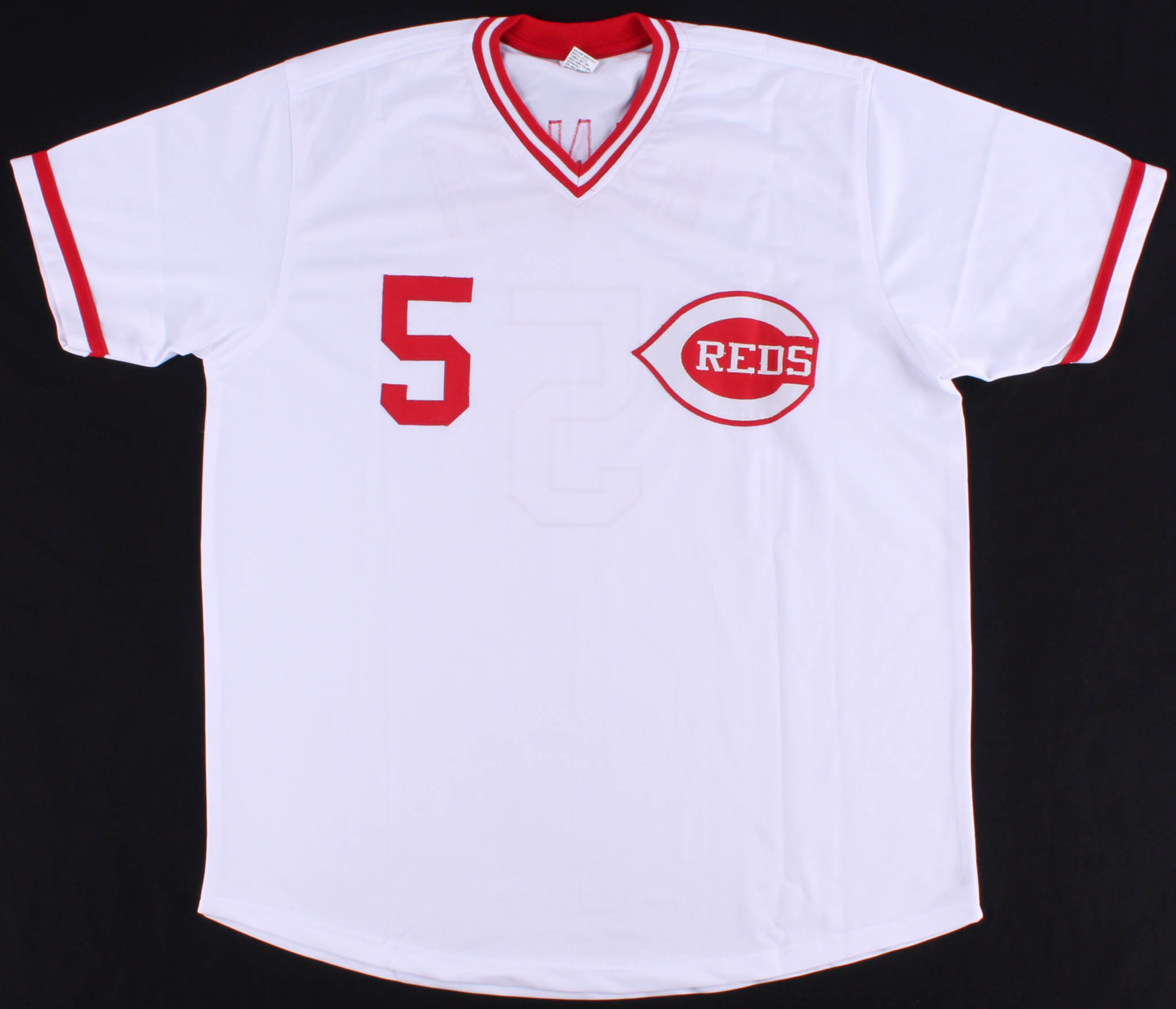 Custom on-field style jersey. Everything sewn on, size XL. Hand signed in silver paint pen by Johnny Bench (HOF).