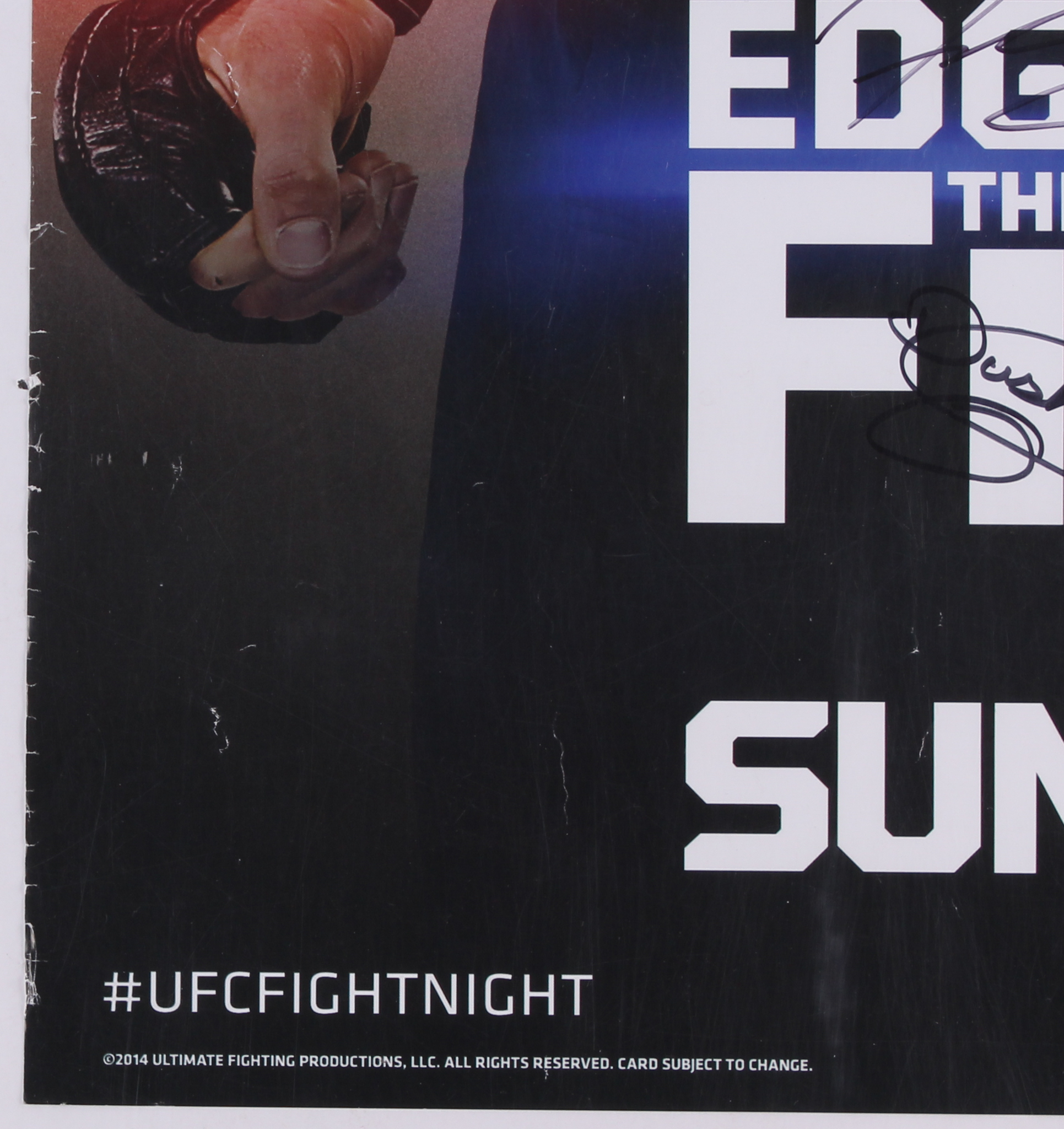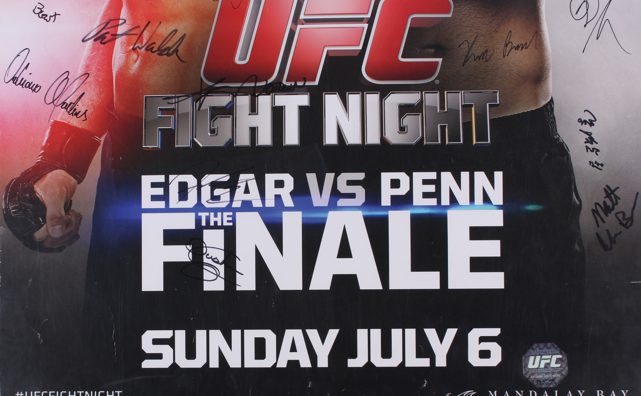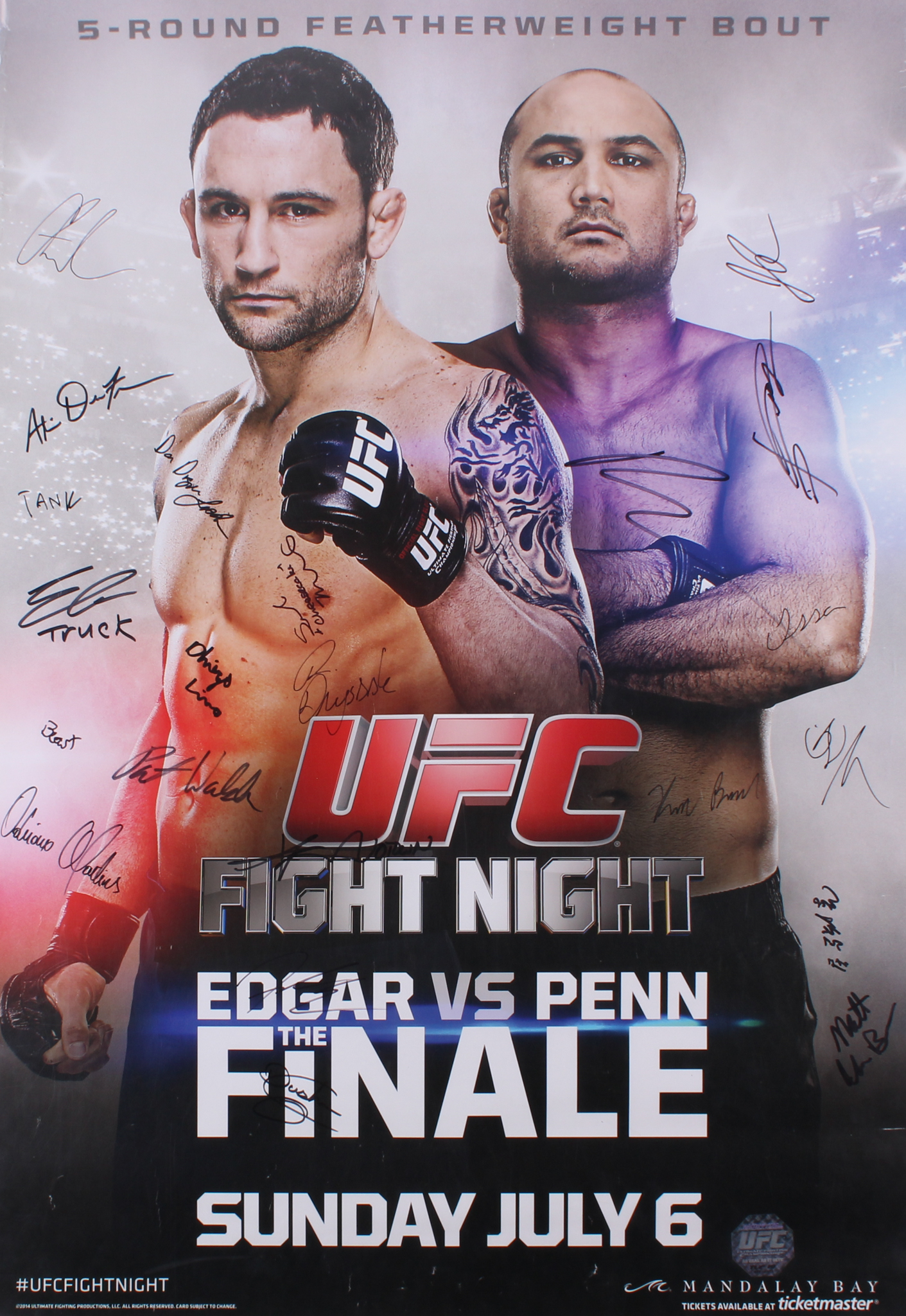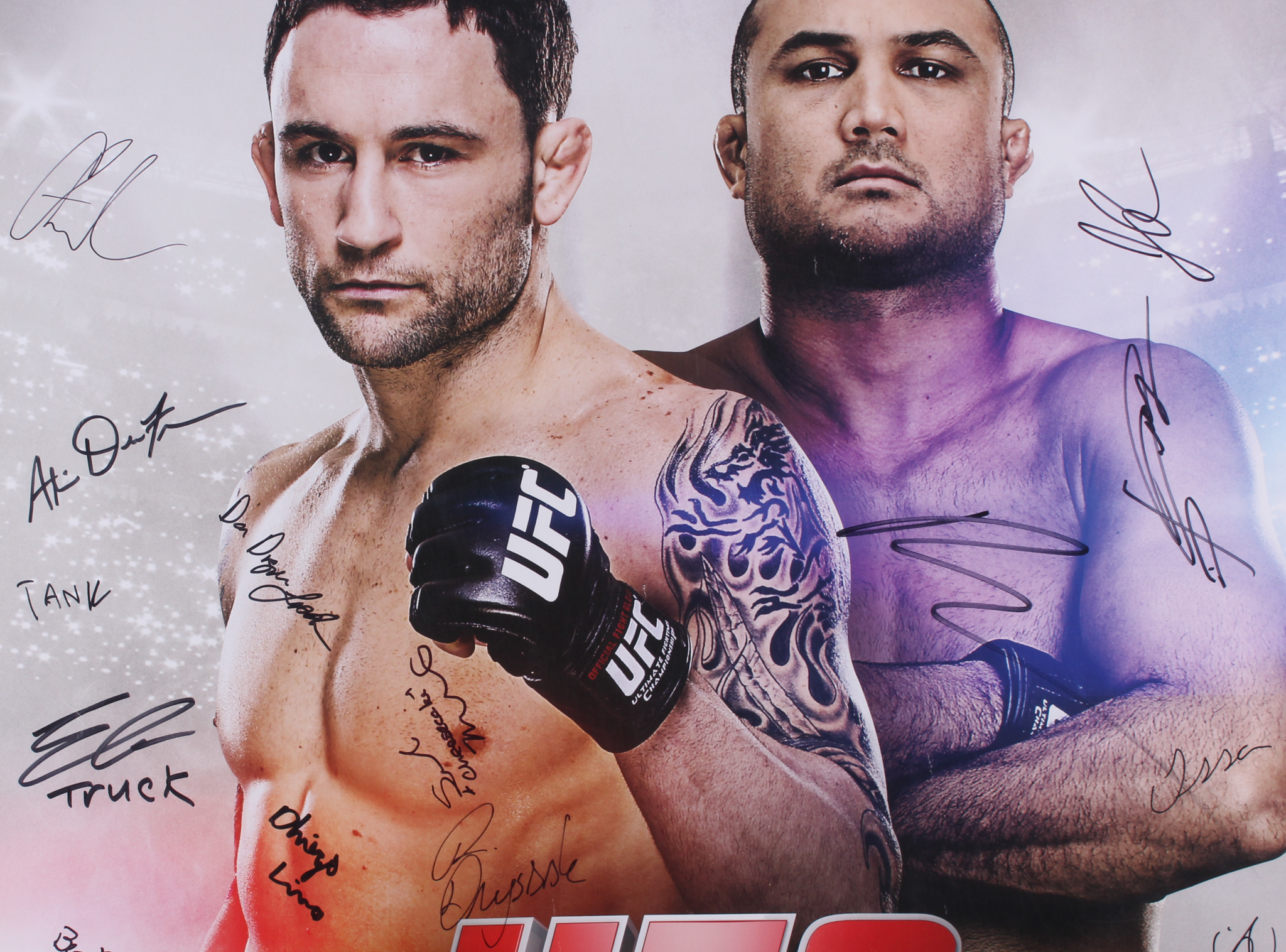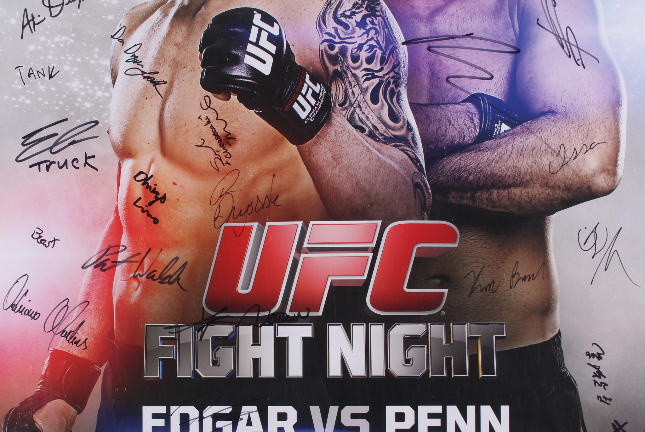Poster measures 27" x 39" in size and has been hand-signed in black felt-tip pen by (22) fighters including Frankie Edgar, BJ Penn, Corey Anderson, Matt Van Buren, Eddie Gordon, Diego Lima, Derrick Lewis, Guto Inocente, Dustin Ortiz, Justin Scoggins, Kevin Lee, Jesse Ronson, Leandro Issa, Jumabieke Tuerxun, Adriano Martins, Juan Puig, Patrick Walsh, Daniel Spohn, Sarah Moras, Alexis Dufresne, Robert Drysdale, and Keith Berish. Please note, the poster has wear and tear around the edges that can not be seen once framed.