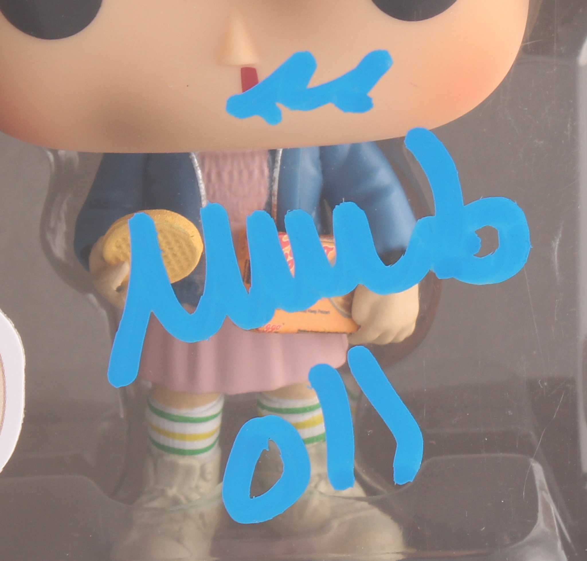 Figure measures approximately 4" tall and is hand-signed in blue paint pen on the box by Millie Bobby Brown (Eleven).