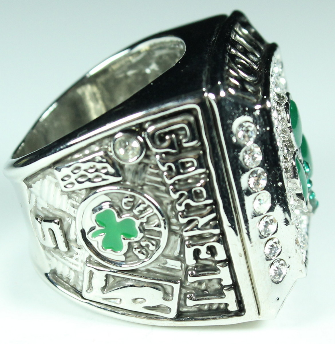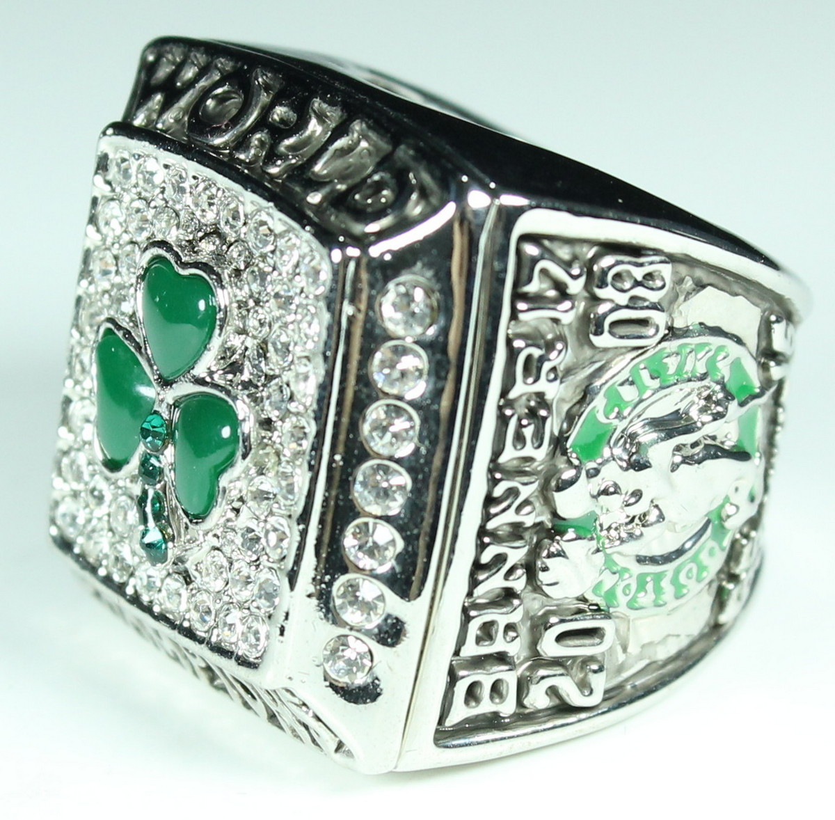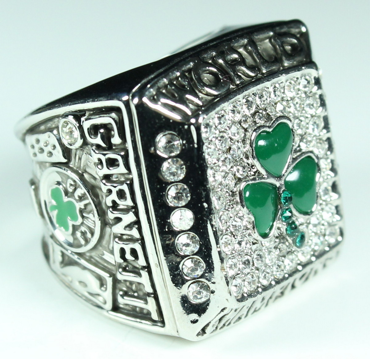 Kevin Garnett Boston Celtics High Quality Replica 2008 NBA World Champions Ring. The ring has been hand crafted by professional jewelers. Made of metal alloy and clad with Rhodium. Size 10.