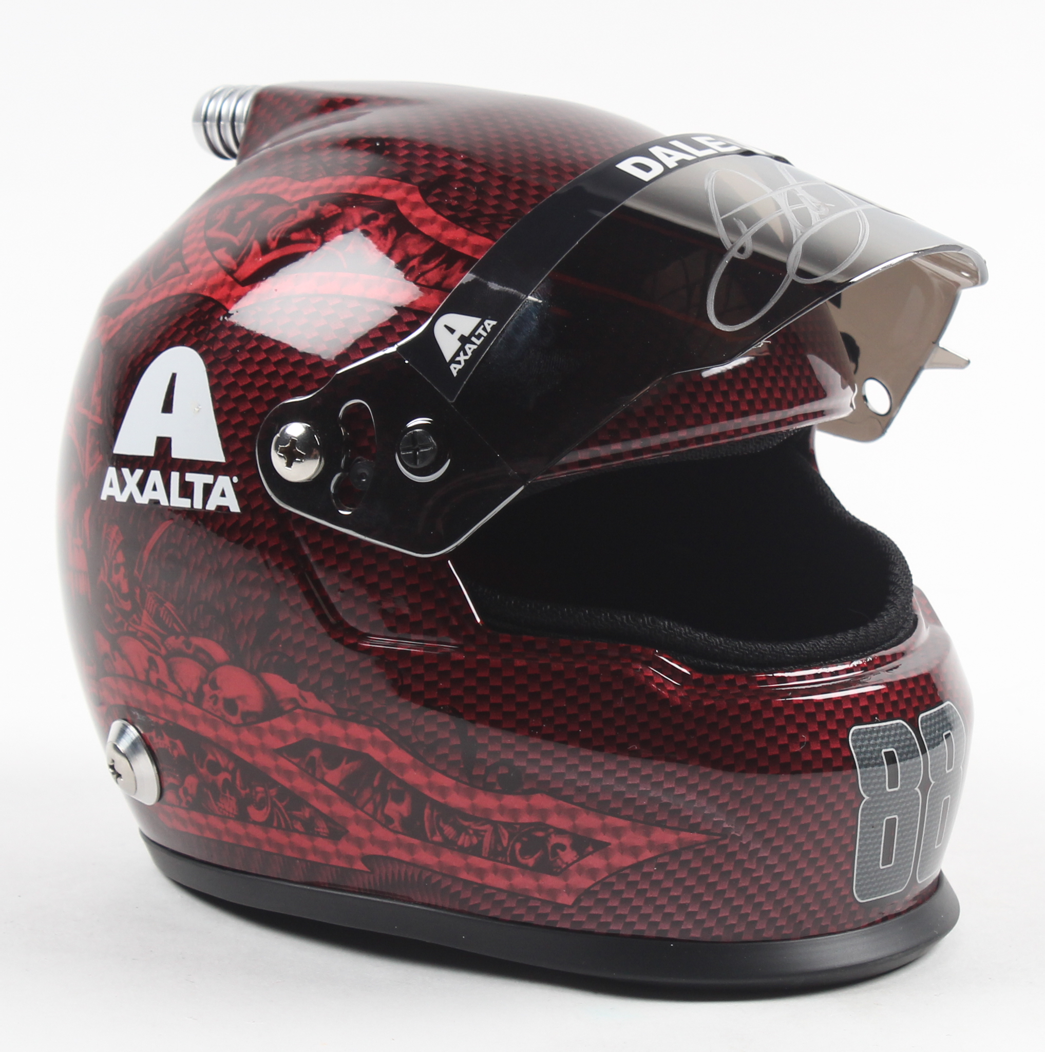 Mini 1:3 scale NASCAR mini-helmet hand-signed on the visor in silver paint pen by Dale Earnhardt Jr.
