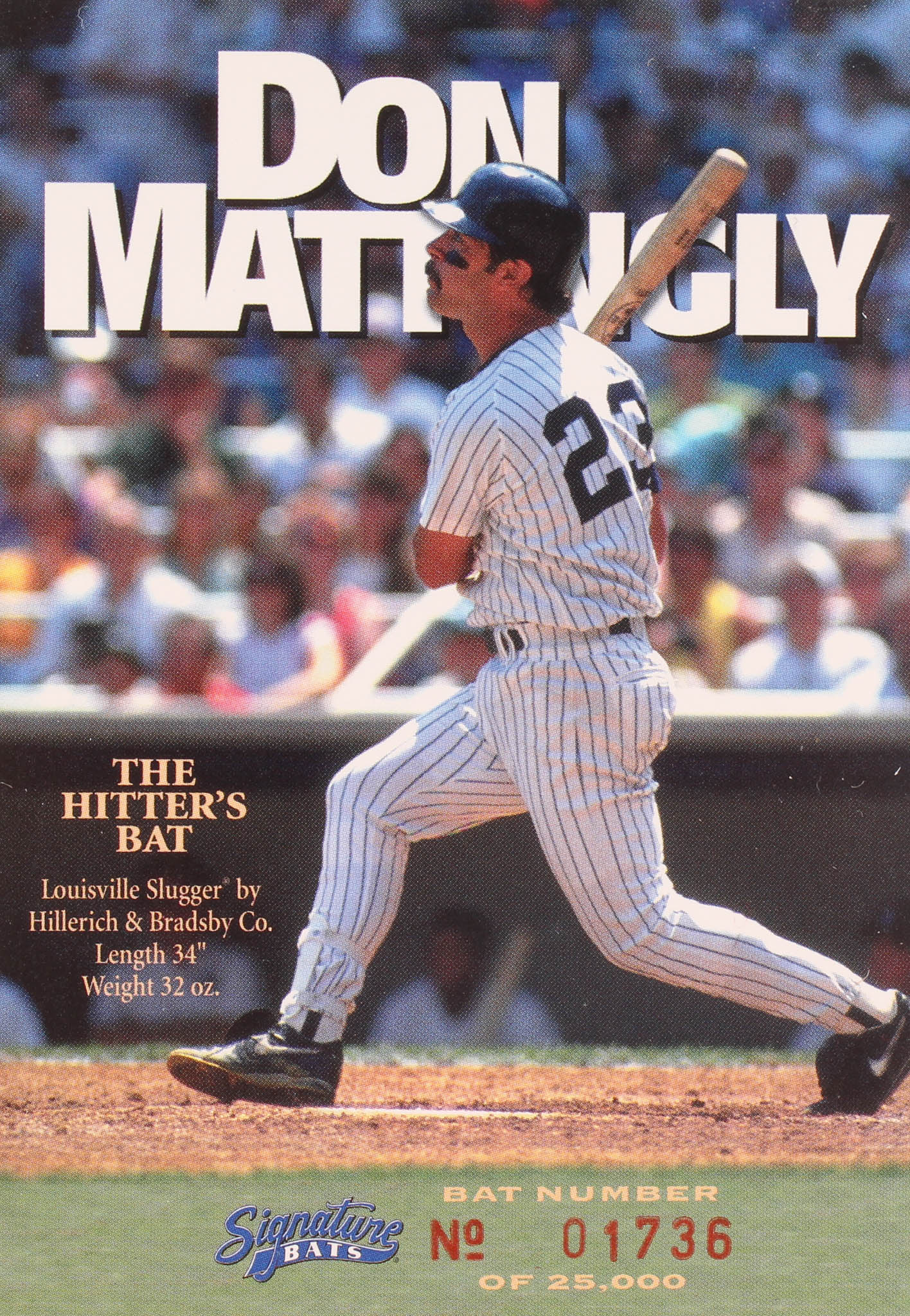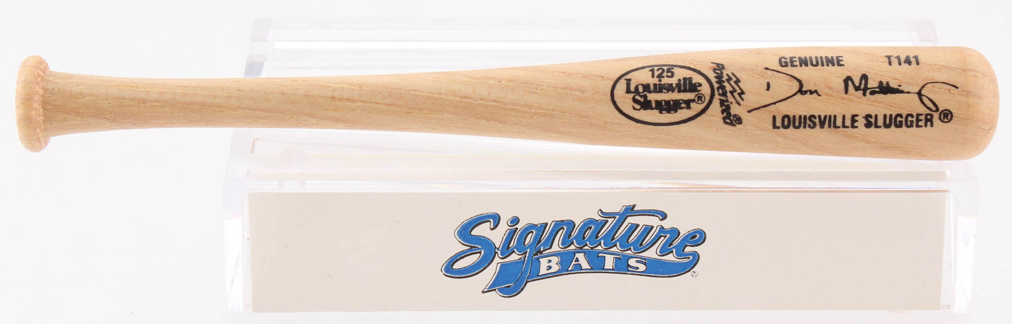 Signature Bats Mini Louisville Slugger Display features a Don Mattingly mini baseball bat, display base, and Signature Bats Collector's Card. The display is limited edition #1,736/25,000.
